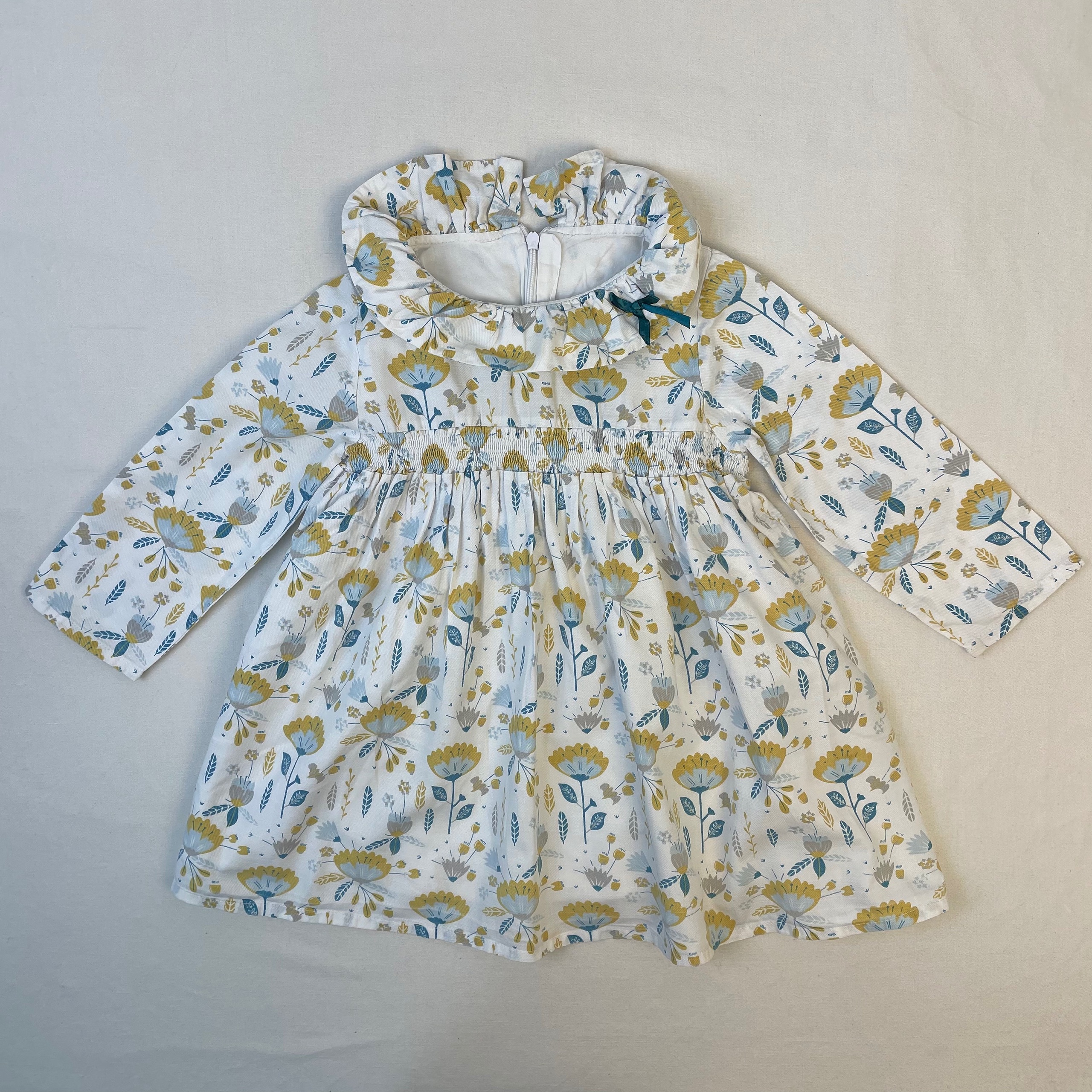 - Robe manches longues, col collerette, taille élastique, fermeture par zip au dos, jupon.