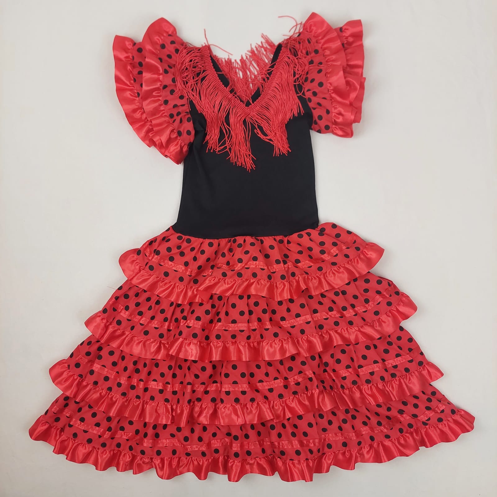 Autres commentaires : Robe de sevillane infantile, col v, manche avec deux volants, le bas en 4 volants décores avec une bande de satin, le haut de la robe est élastique pour mieux s’adapter au corps