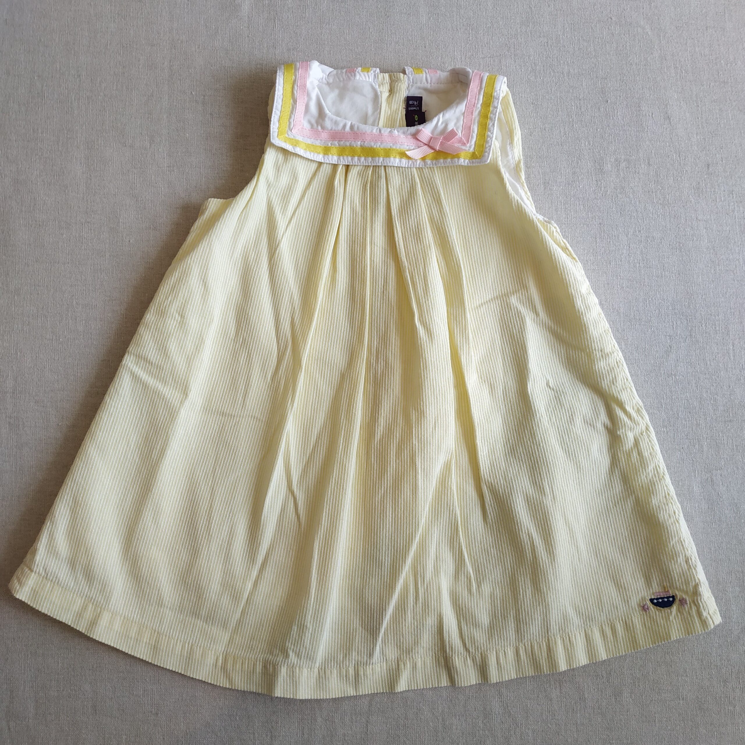 Autres commentaires : Robe sans manches col marin, motif rubans rose et jaune, petites rayures blanches sur fond jaune, doublée en blanc. Fermeture par 6 boutons tout le long du dos
