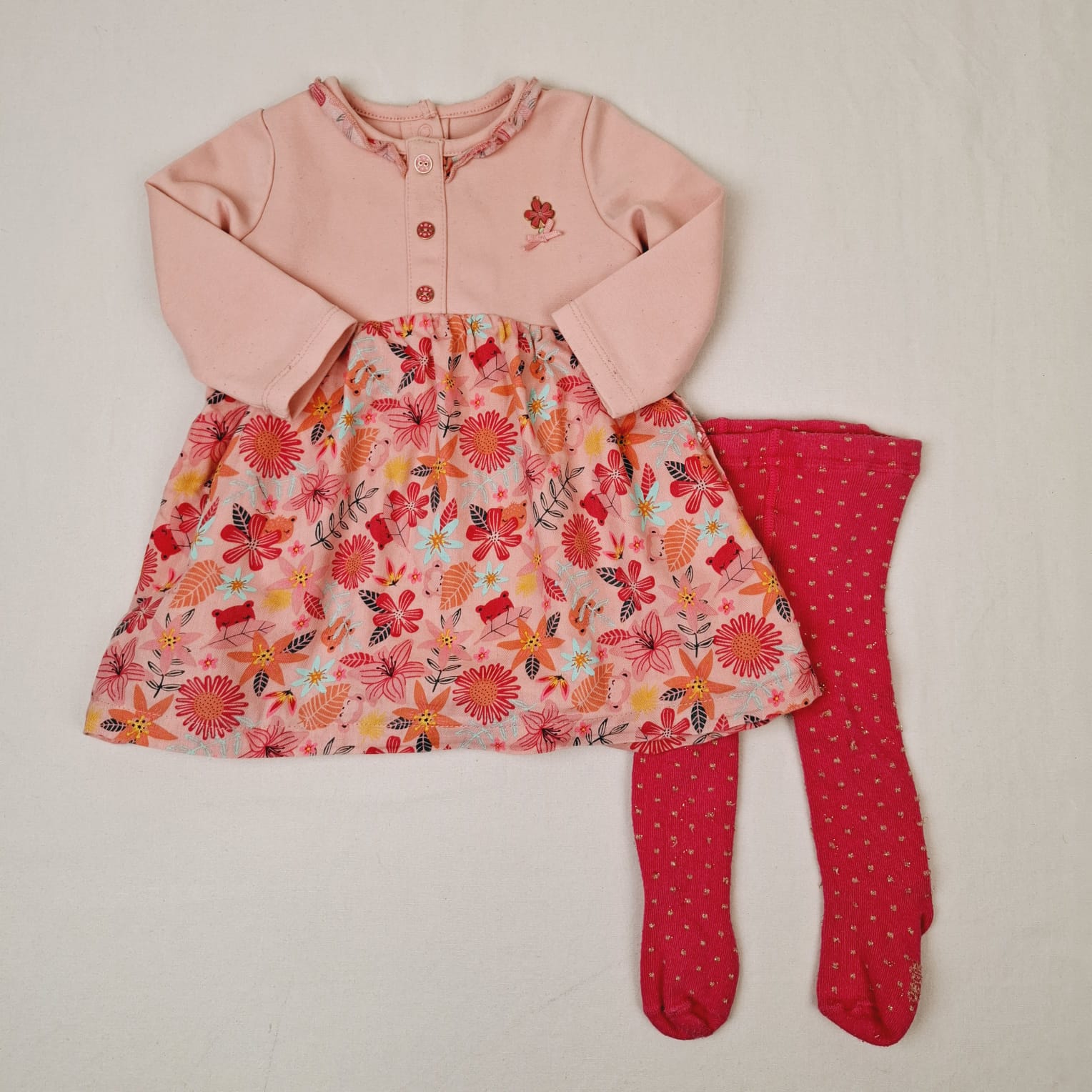 Autres commentaires : Robe rose à manches longues, haute 63% polyester, 2% élasthanne, bas en coton 100% à motif fleuri, doublure en coton 100%, col rond volanté, fermeture par boutons pression au dos. – Collants Obaibi rose à pois doré.