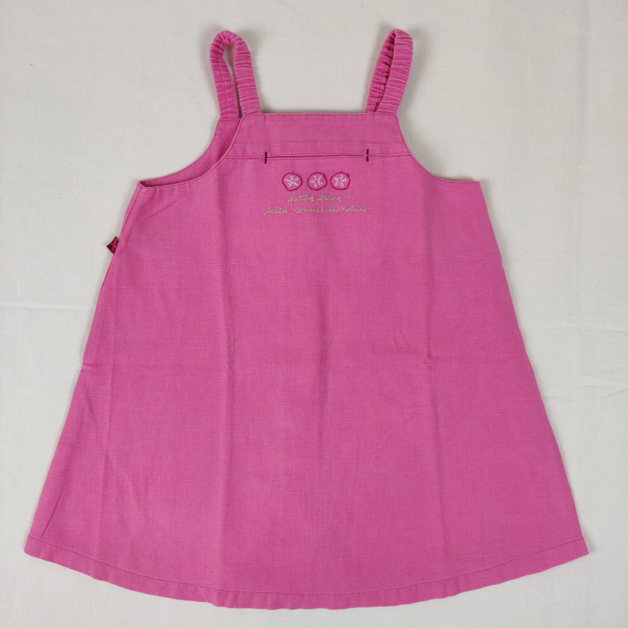 Autres commentaires : Lin 15% – Robe rose à fines bretelles élastiques . Fermeture au dos avec des boutons classiques et rabat en tissu. Motif trois fleurs blanches accompagné d’une phrase en broderie.