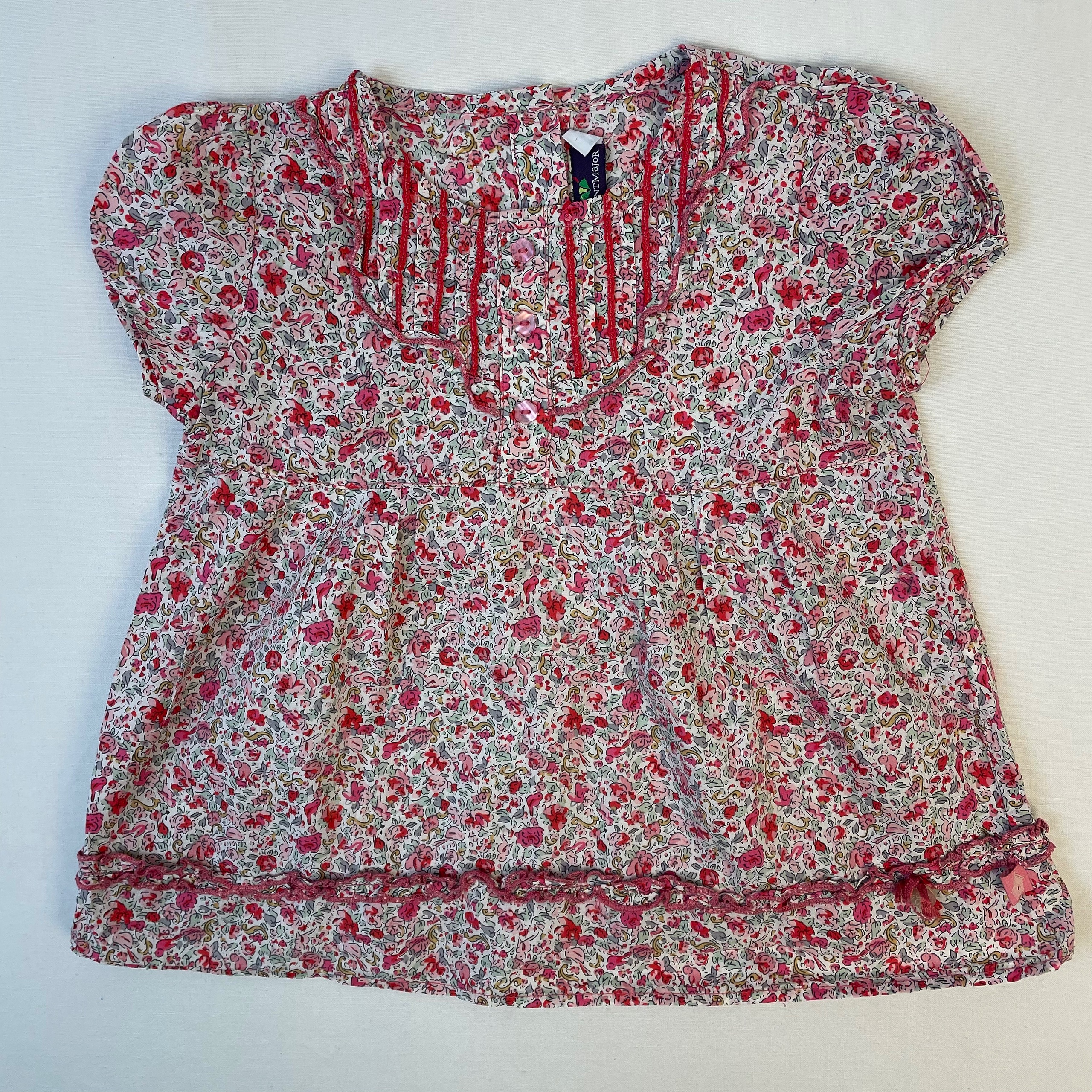 - Robe à manches courtes en Liberty. Ouverture verticale sur le haut du dos et à l’avant via des boutons classiques roses.