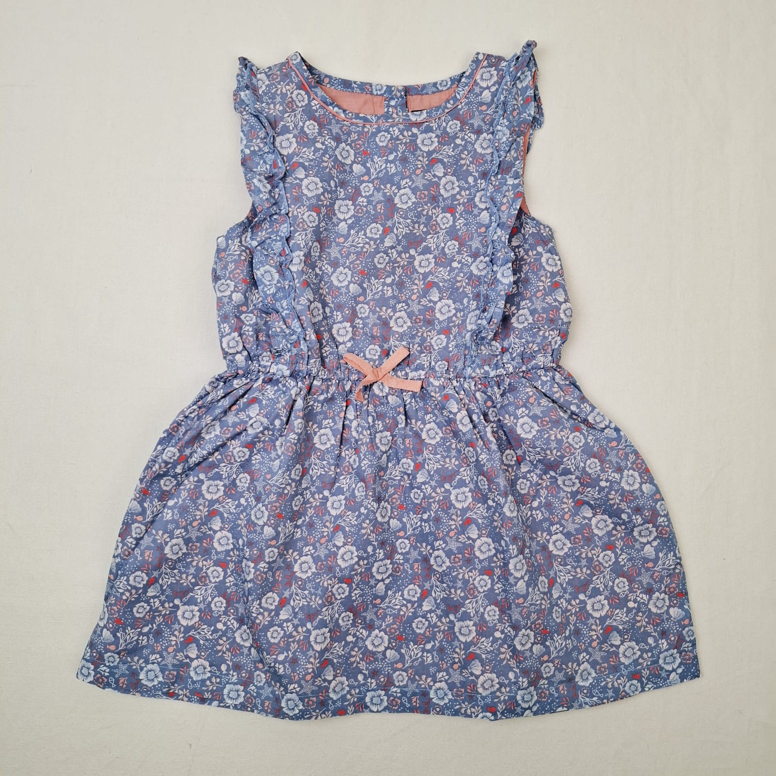 Autres commentaires : Robe sans manches bleue avec imprimé fleuri blanc et rose, volants latéraux à l’avant et à l’arrière, doublure rose en 100% coton, col rond, fermeture au dos, taille élastiquée.
