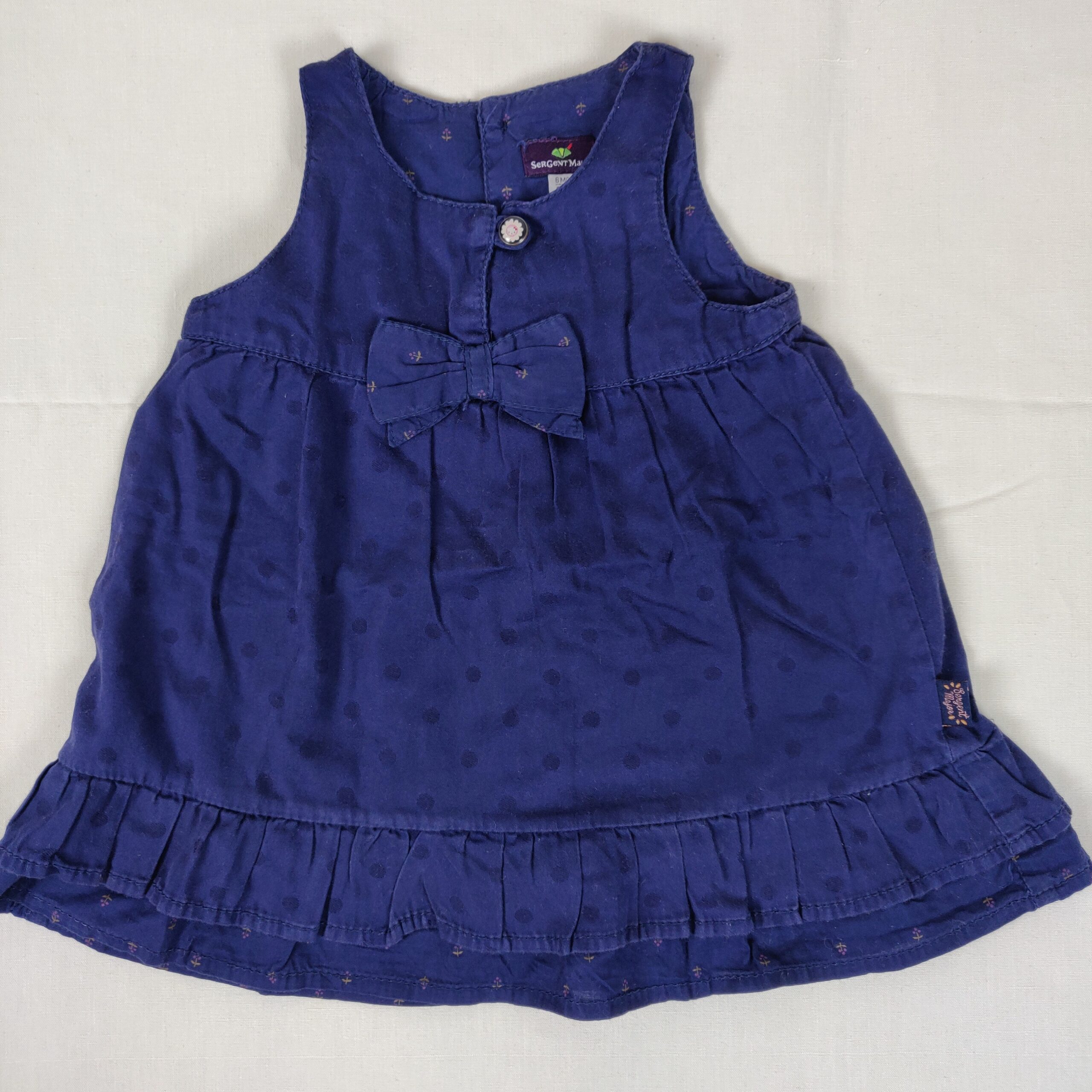Autres commentaires : Robe sans manches bleu marine avec motif pois ton sur ton, fermeture par boutonnière classique dans le dos, noeud décoratif devant et double volant en bas de robe.