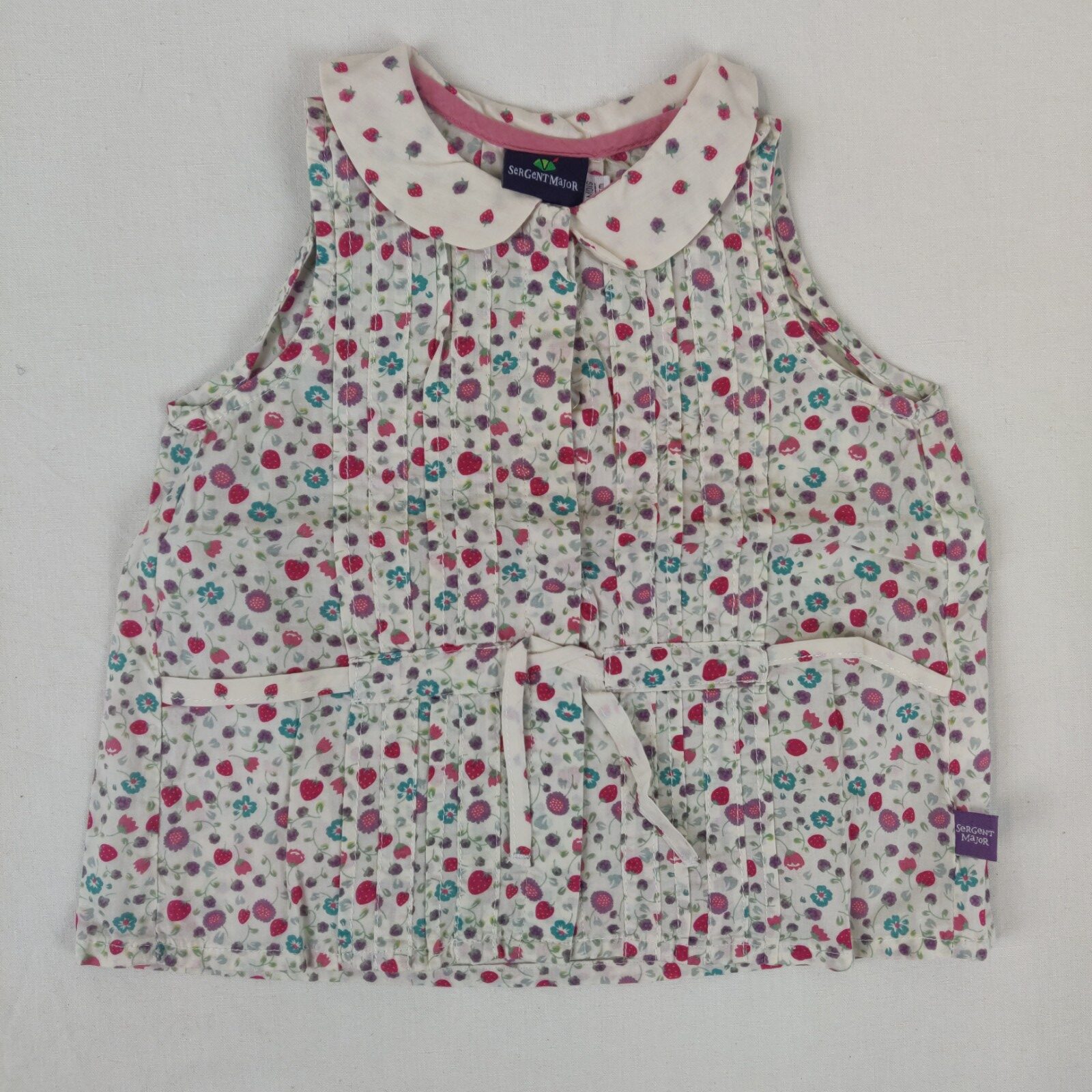 Autres commentaires : Robe sans manche – blanc à motifs fleurs et fruits. Col claudine. Taille ceinturée à l’aide d’un fine bande de tissu. Ouverture centrale à boutons.