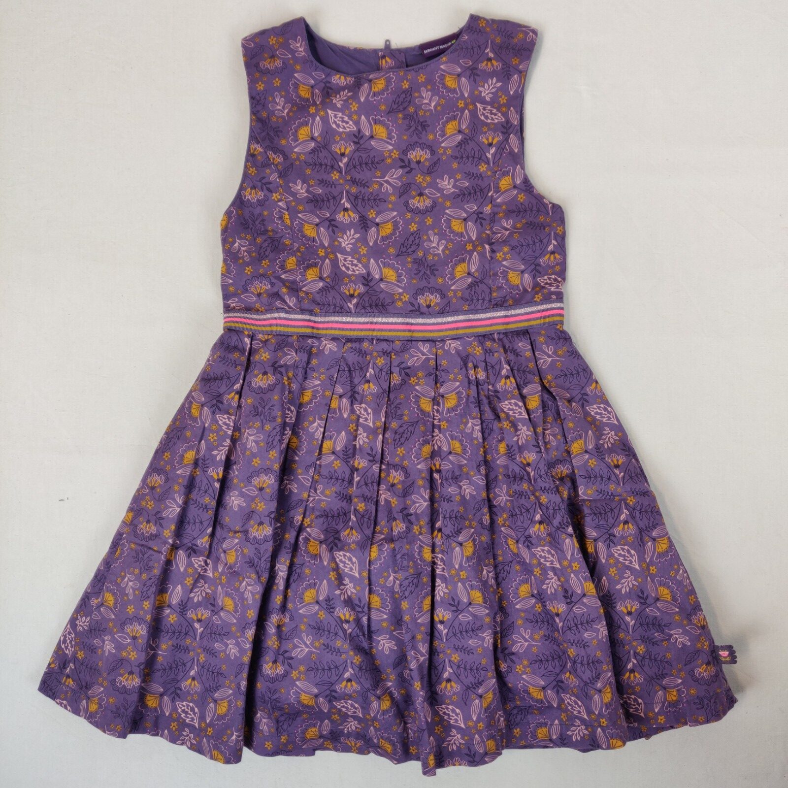 Autres commentaires : Robe fleurette violet avec une fermeture zip au dos et une bande de trois traits au tour de la taille. Taille un peu étroit