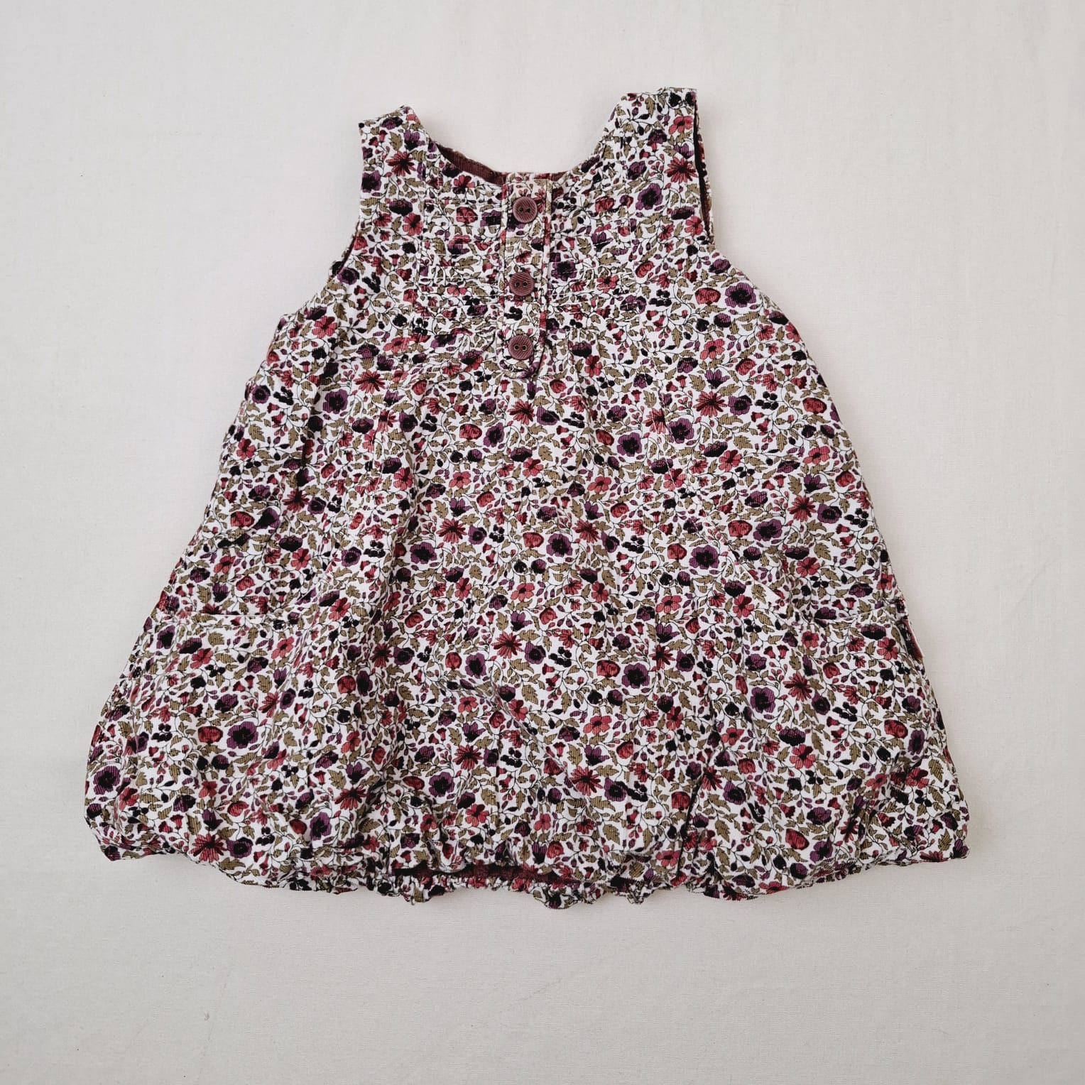 Autres commentaires : Robe sans manches en velours finement côtelé, évasée avec effet un peu boule en bas, imprimé fleuri dans les tons vert, rose et violet, doublure en haut en velours côtelé violet uni, et en bas doublure chaude polaire violette unien 100% polyester, fermeture au dos par boutons.