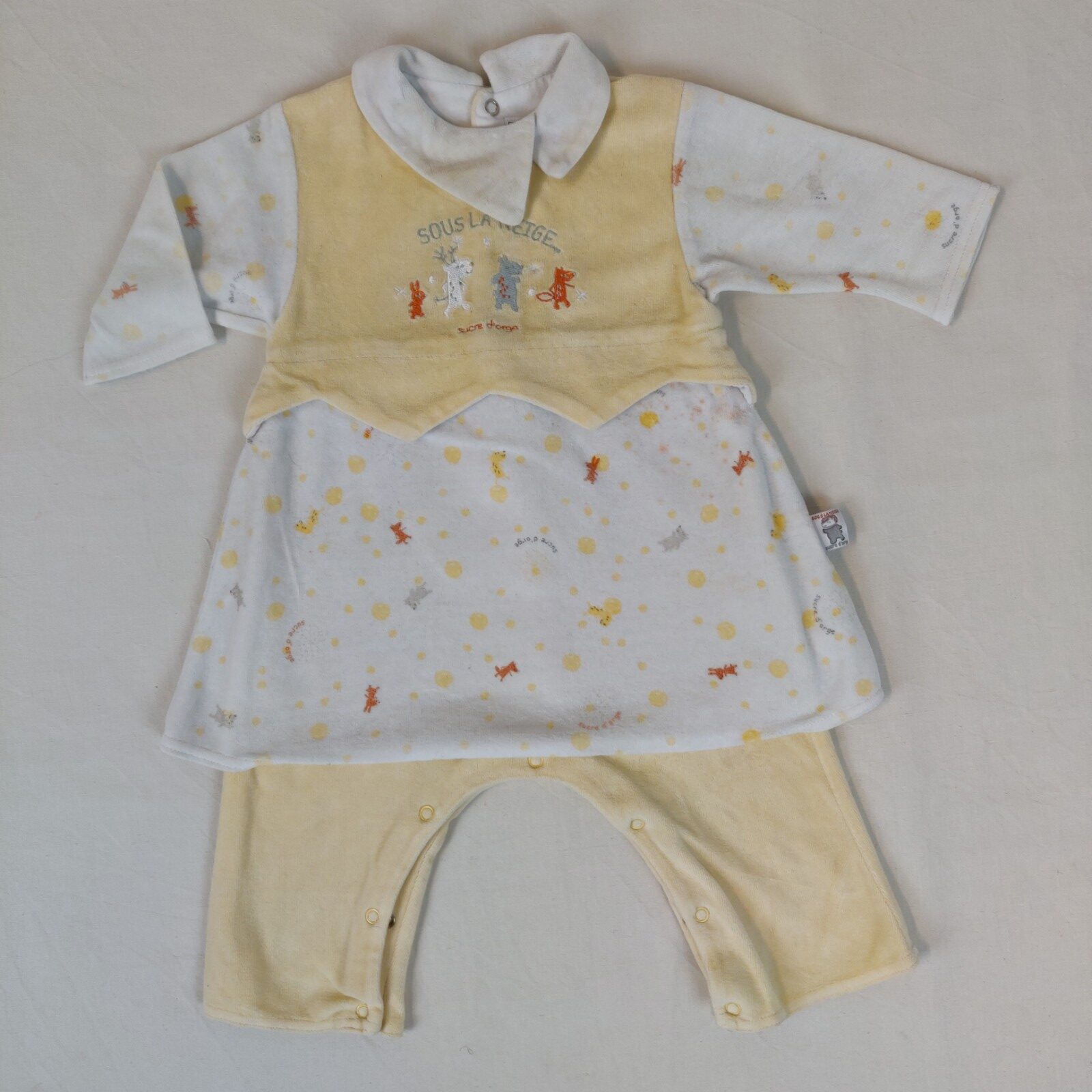 Autres commentaires : Robe jaune blanc manches longues avec pantalon intégré et fermé par des boutons de pressions sur le pantalon et au dos.