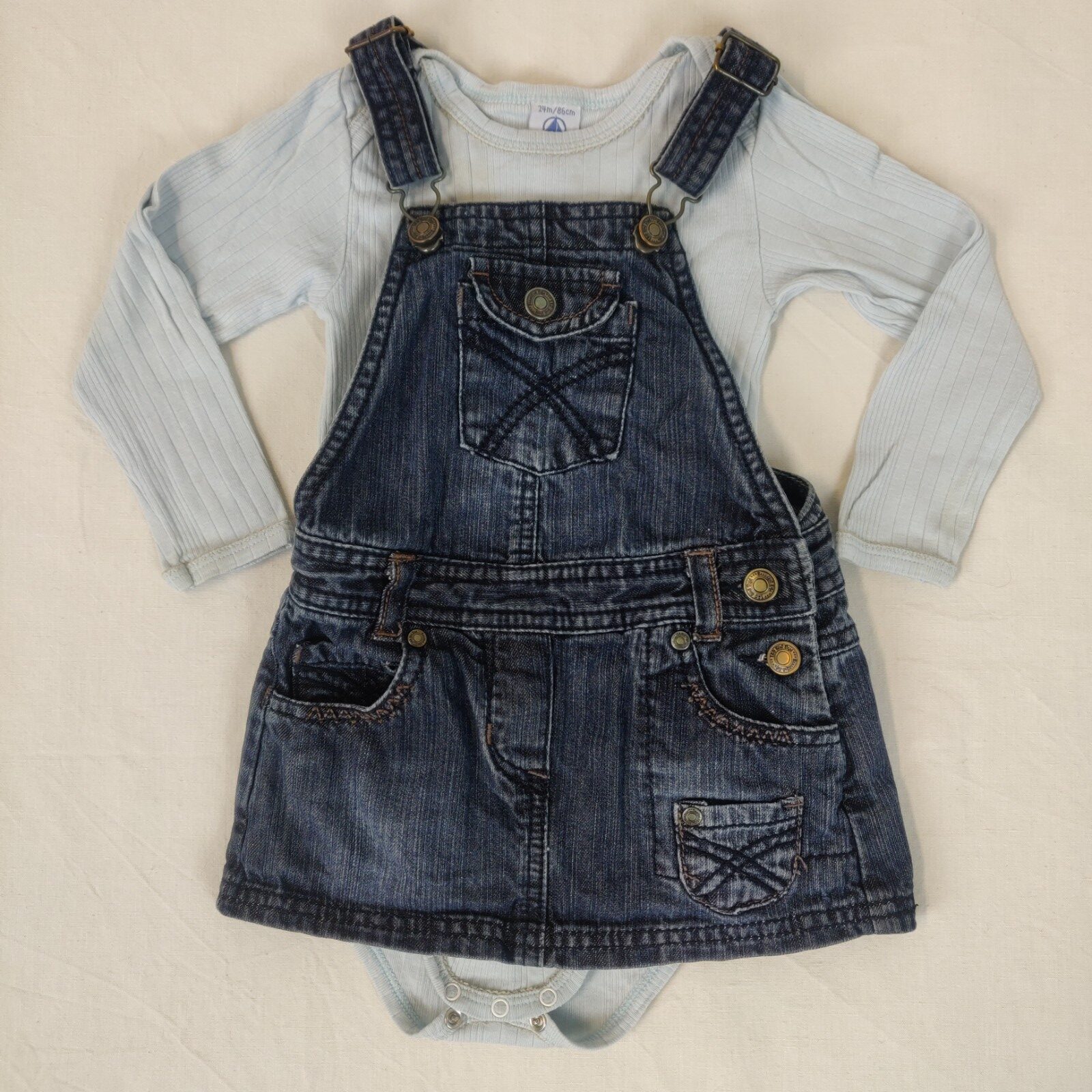 Autres commentaires : Robe salopette en denim – bleu foncé. Boucles salopette réglables. 3 poches latérales et une pochette centrale à rabat. 2 poches arrières. Ouverture latérale gauche à deux boutons. Passants pour une ceinture. Coutures marrons apparentes. Un body à manches longues bleu Petit Bateau offert. Tâche marron clair près du col.