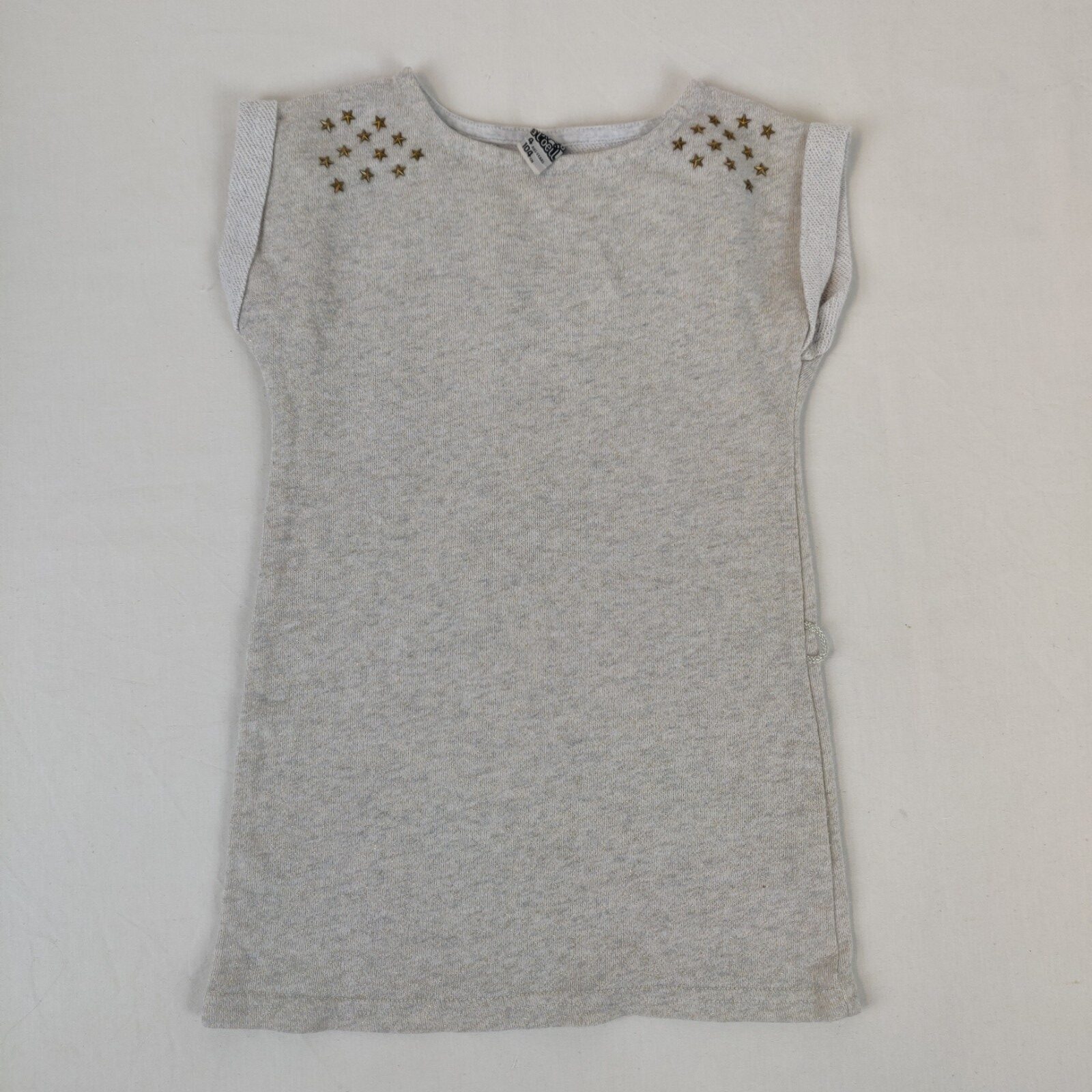 Autres commentaires : 25% fibres métalliques. Robe à manches très courtes – beige pailleté doré. Etoiles métallisées au niveau des épaules. Petite ceinture manquante.