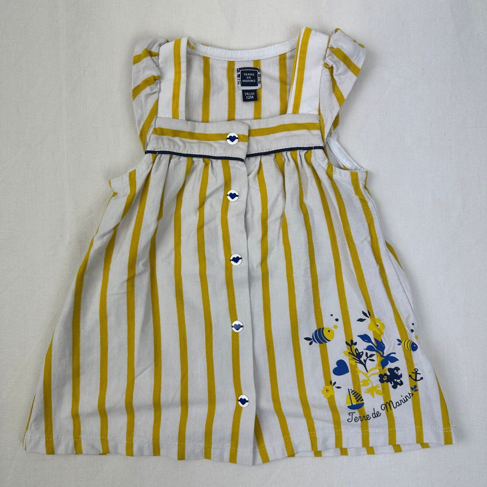 Autres commentaires : Robe blanche avec rayures jaunes sans manches et une fermeture devant par boutons pressions.