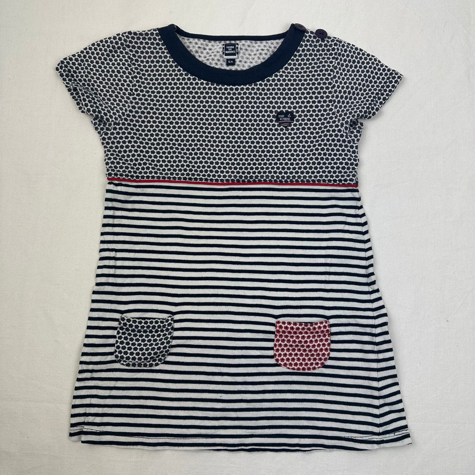 Autres commentaires : Robe manches courtes bleu fleuri en haut et avec des rayures blanches en bas.