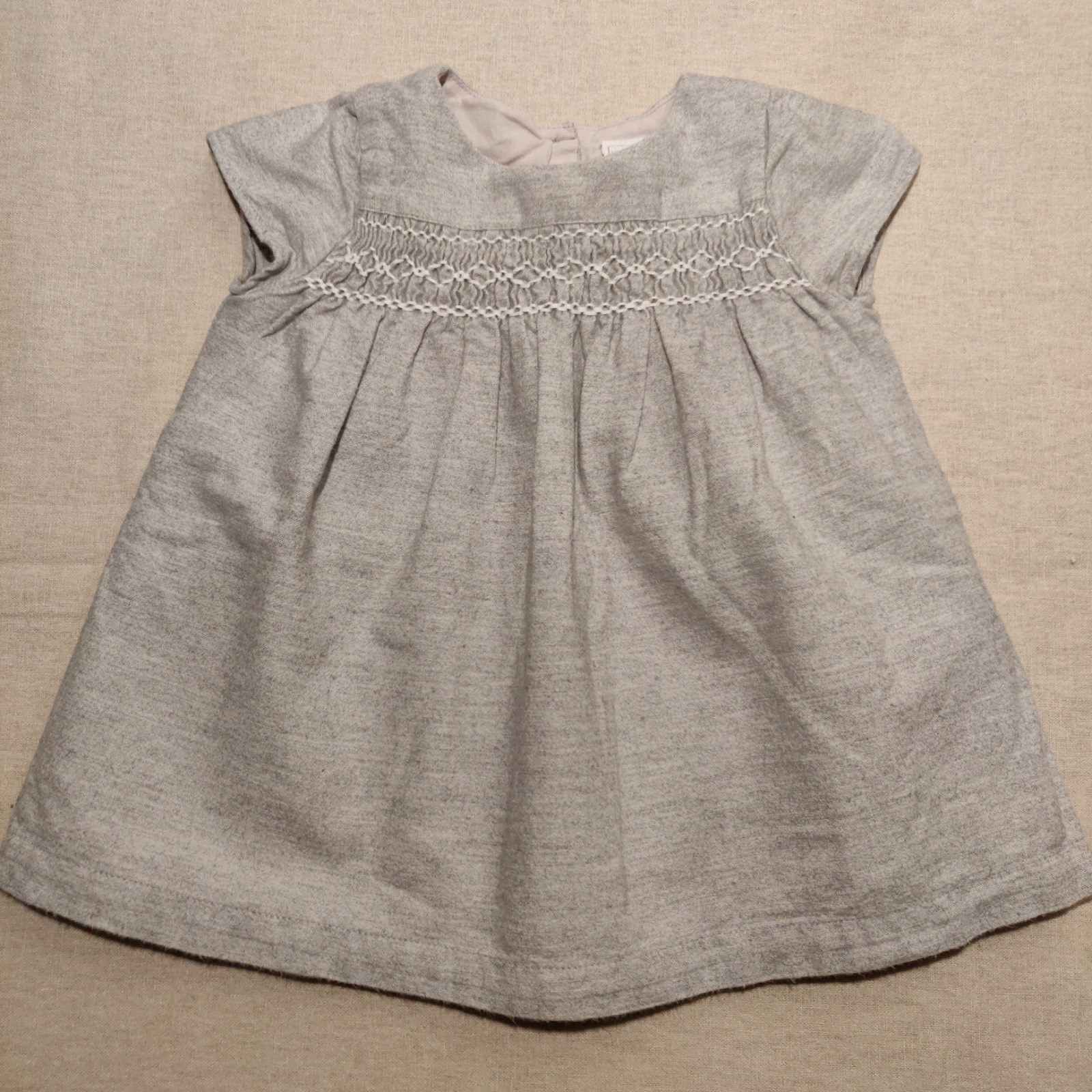Autres commentaires : Robe manches courtes à smocks gris chiné en coton peigné. Doublure en coton gris clair, fermeture par 3 boutons au dos.
