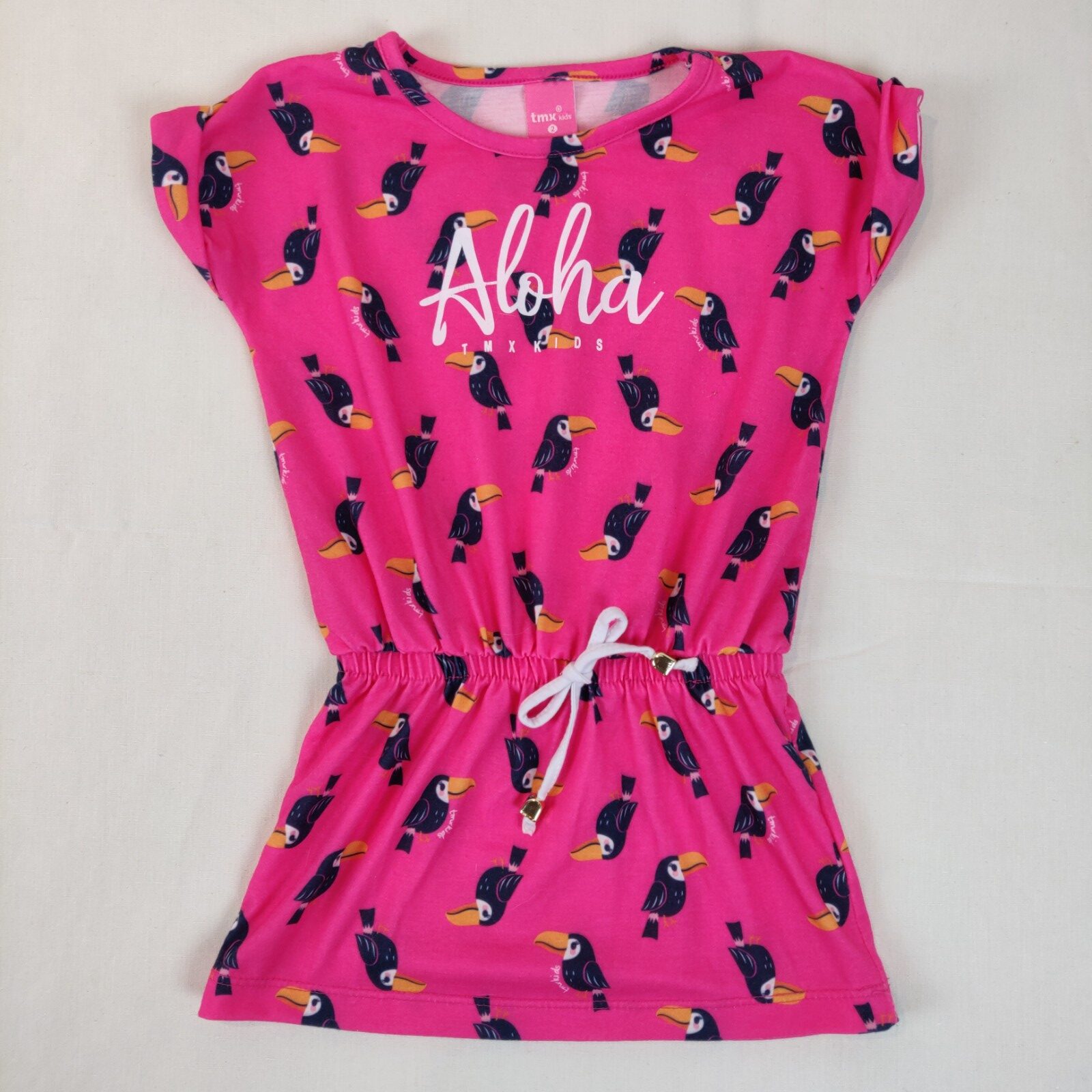 Autres commentaires : 4% élasthanne. Robe à manches courtes retroussées – rose avec motifs pélicans et inscription blanche « Aloha ». Taille ceintrée et élastique avec un noeud bland central décoratif.