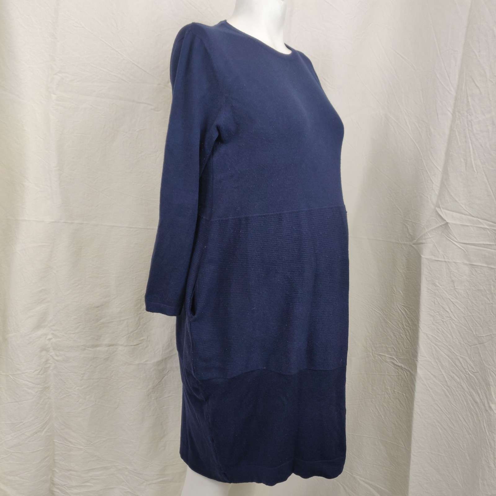 Autres commentaires : 25% modal, 20% laine, 10%cachemire, 10% élasthanne. Robe manches longues col rond, taille très ample. Bouloches d’usage