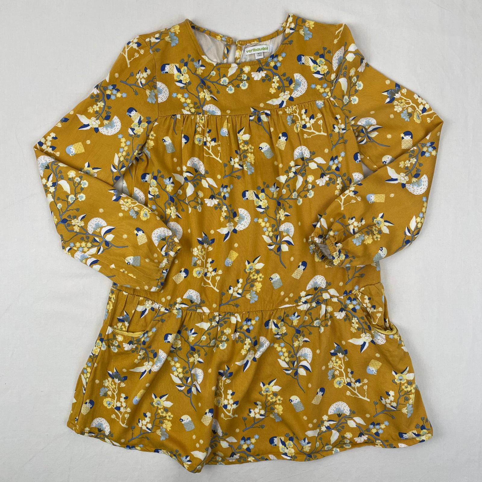 Autres commentaires : Robe jaune moutarde à imprimés fleuris et Kokeshi, un bouton dans le dos au niveau du col. Poches sur la jupe.
