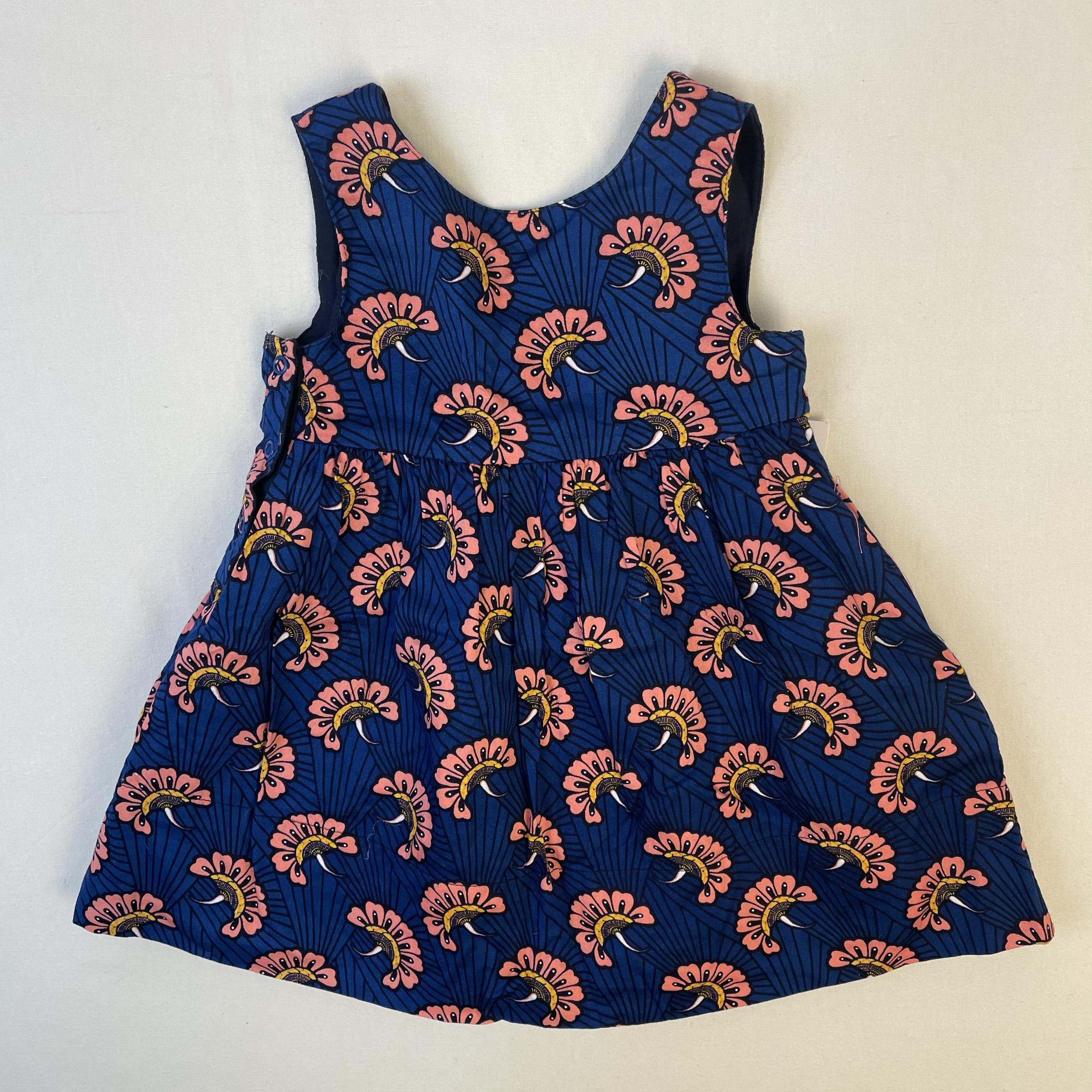 - Robe réversible, une face couleur bleu nuit unie, l’autre face bleu marine avec motifs fleurs roses , fermeture par boutons pressions au dos