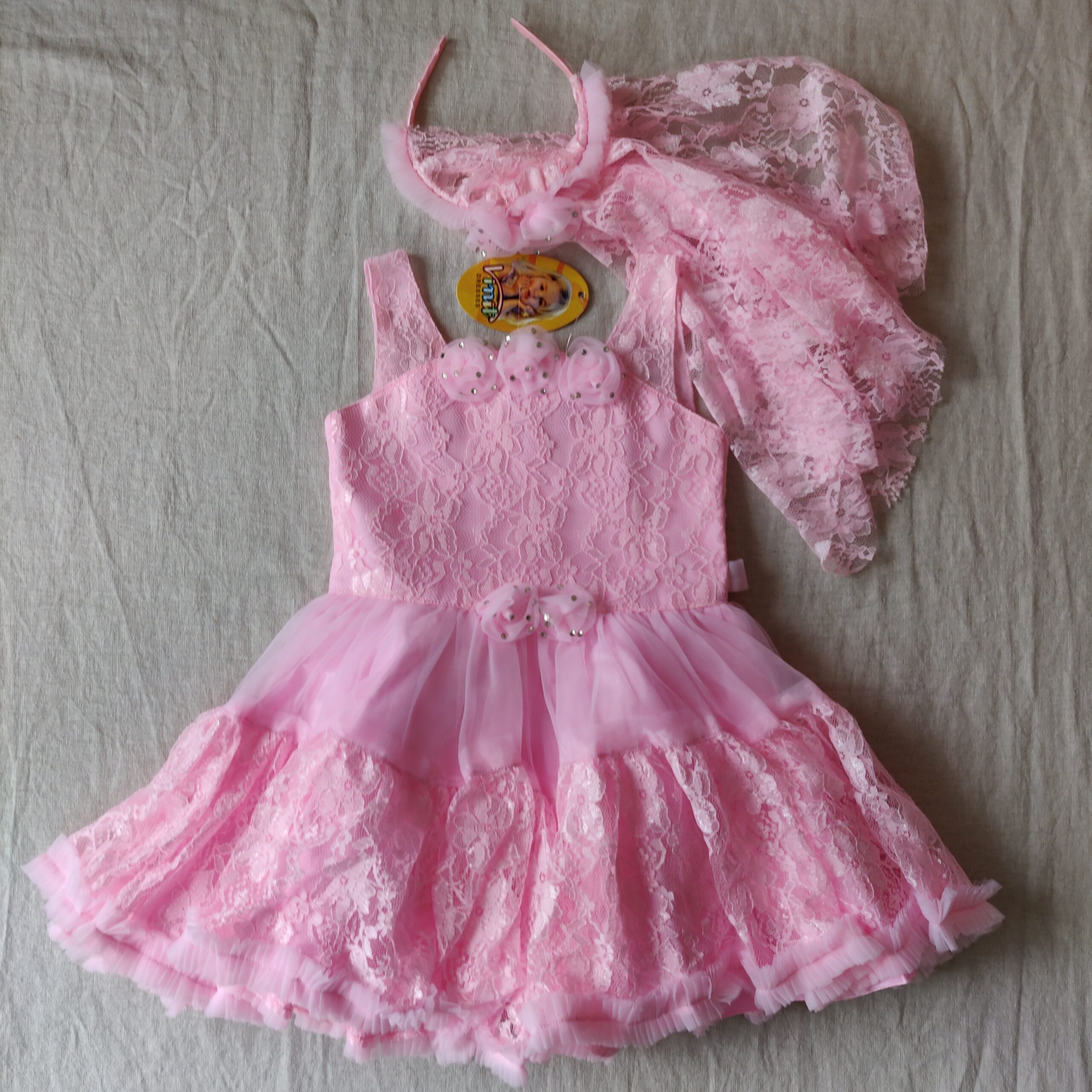 Autres commentaires : Robe rose bonbon pour occasion spéciale (taille estimée 18 à 24 mois) avec volants et bretelles en dentelle et doublure intérieur – serre-tête assorti avec voile en dentelle – dentelle au niveau du bustier – roses en relief avec pierres scintillantes – fermeture éclair dans le dos