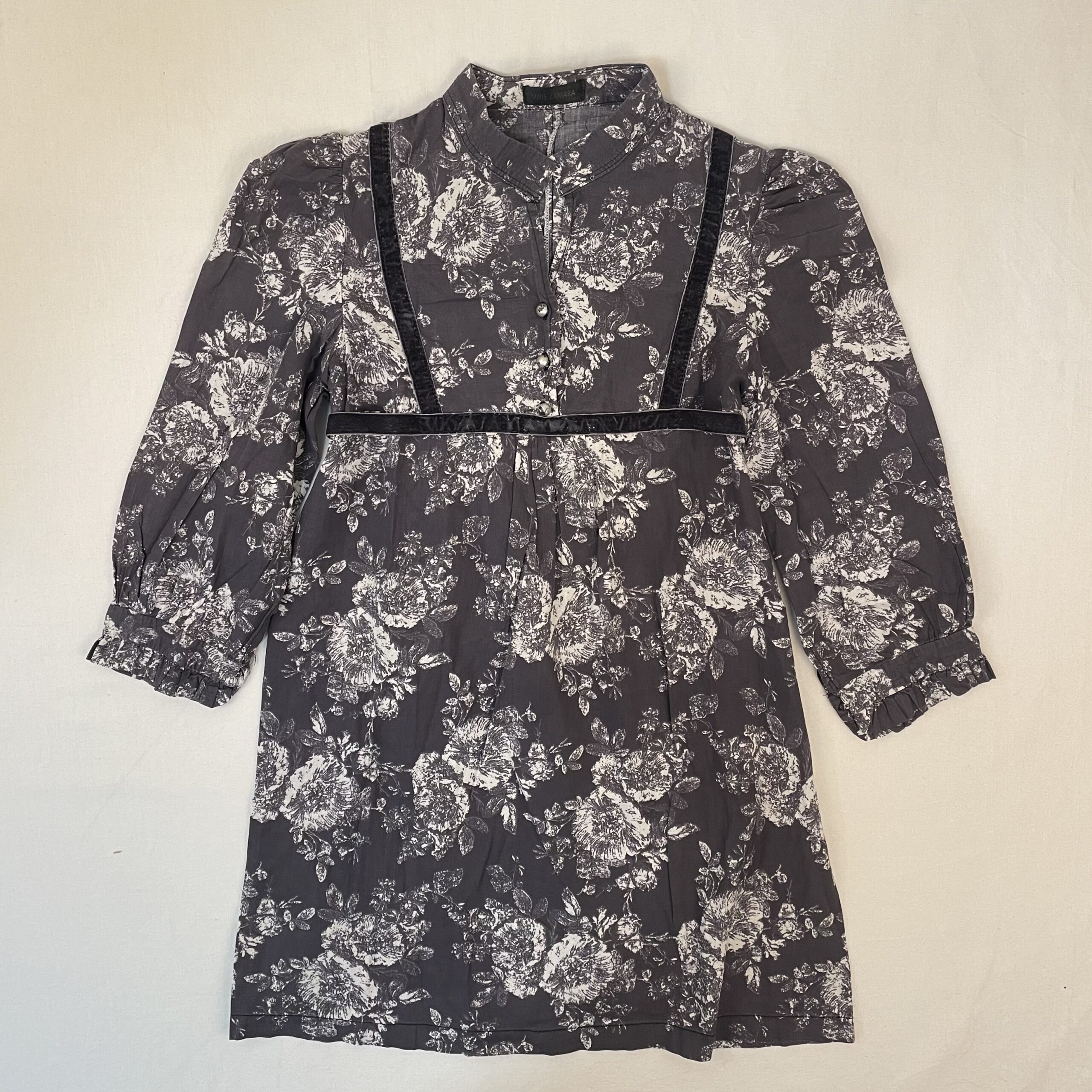 - Robe manches longues, col tunisien, fermeture par boutons classiques, taille avec ceinture en velours, motifs floral. Boutons avec défauts. La taille environ 6 ans.