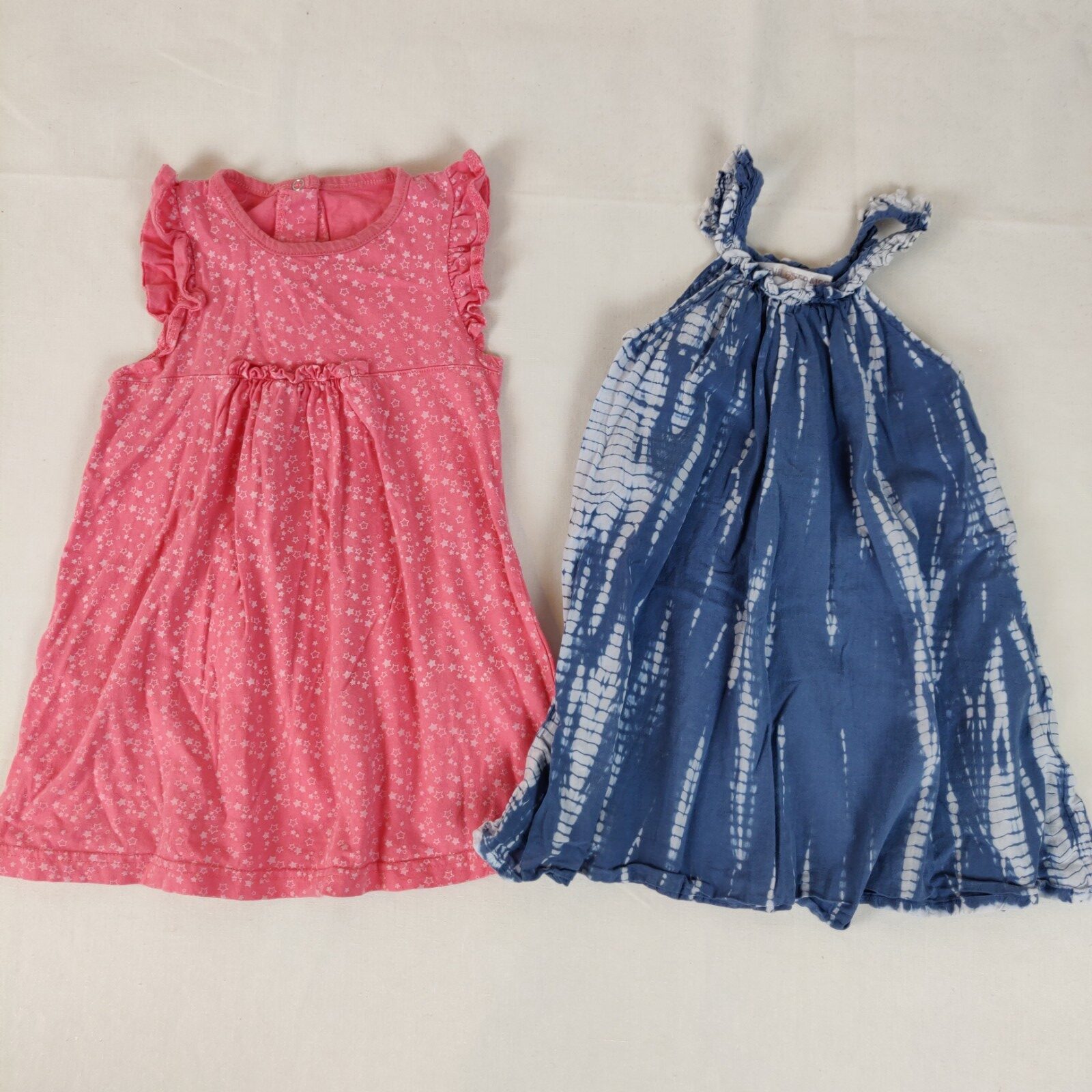 Autres commentaires : 2 robes sans manches, l’une sans marque rose à petites étoires blanches, fronces à la taille et aux épaules. L’autre bleu gris à effets délavées Vynil Fraise, débardeur débardeur col rond à petits volants. Les deux sont en bon état.