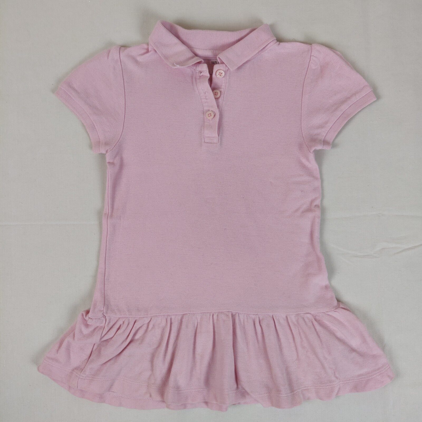 Autres commentaires : Robe à col Polo – rose. Ouverture centrale à 3 boutons classiques nacrés. Jupe légèrement plissée.