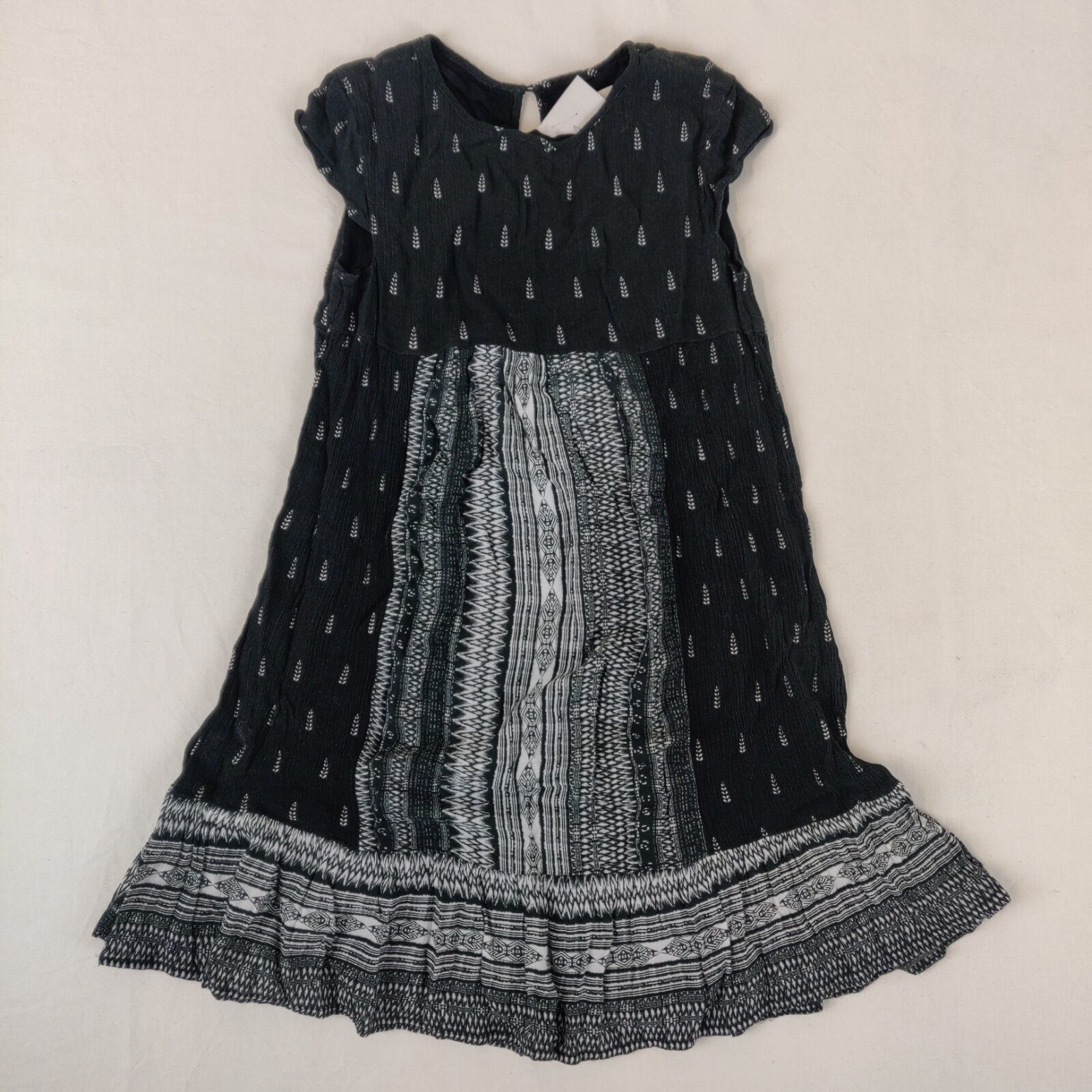 Autres commentaires : Robe à manches très courtes – noir. Motifs floraux blancs. Motifs géométriques blancs au niveau de la jupe. Ouverture à un bouton au dos.