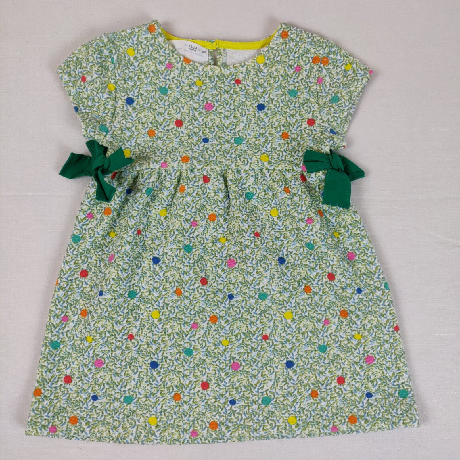 Autres commentaires : 45% polyester, 6% élasthanne. Robe manches courtes, col rond, blanche à motifs de feuilles vertes et bleus, et boules multicolores. Jupe un peu froncée, un noeud vert en tissu de chaque côté, fermeture au dos par un bouton au cou.