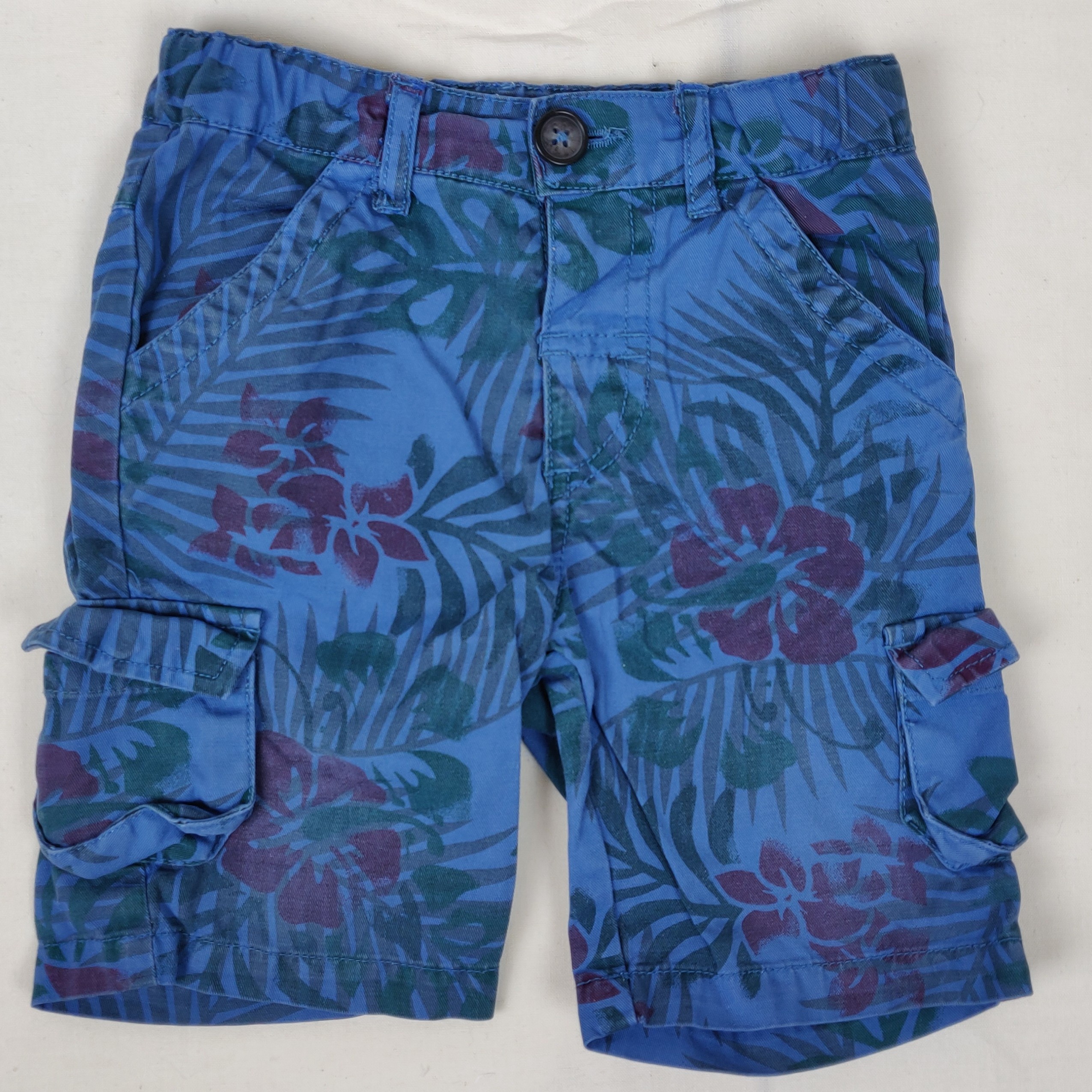 Autres commentaires : Bermuda bleu à motifs feuilles et fleurs exotiques verts et bordeaux, effet treillis.