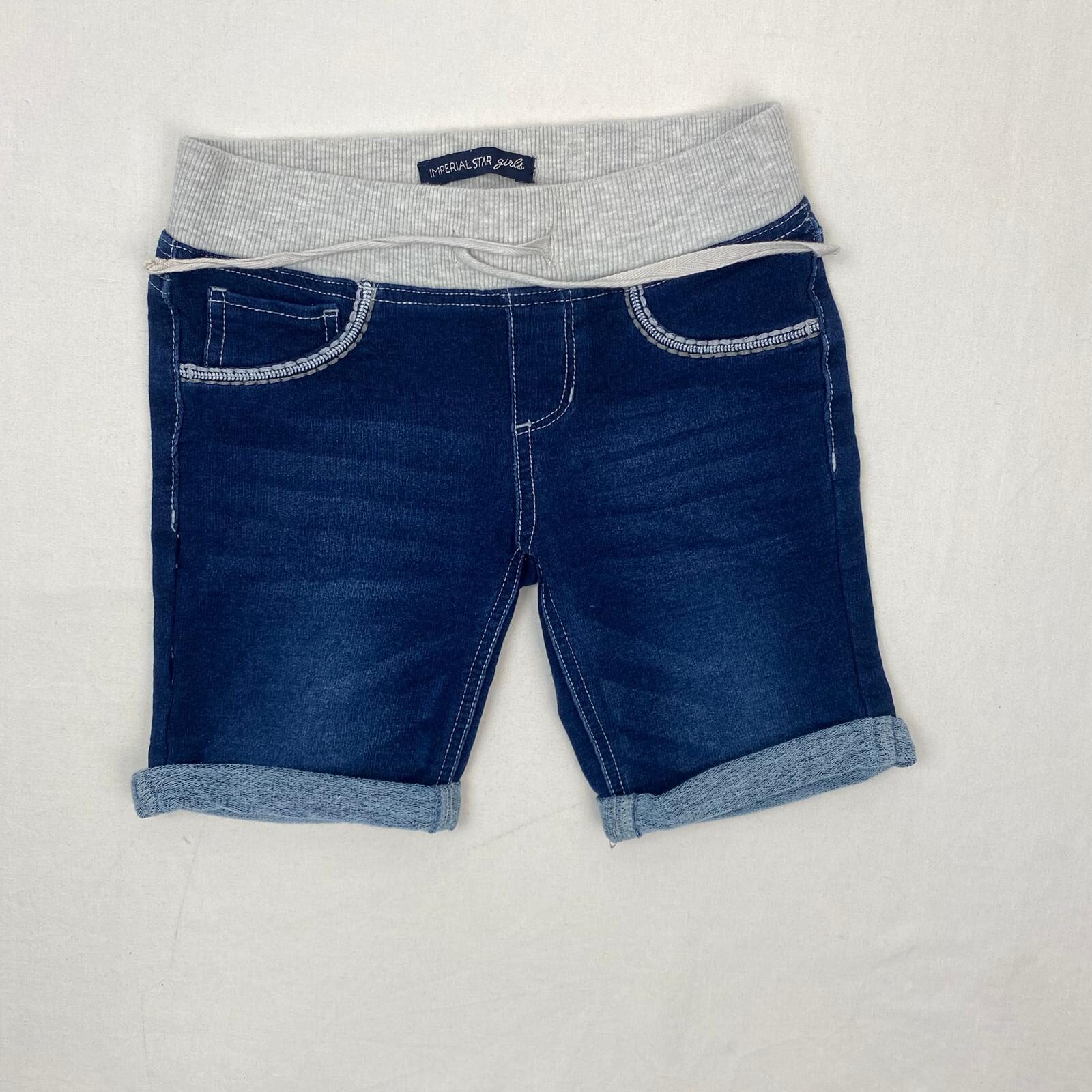 Autres commentaires : 15% polyester. Bermuda bleu et gris, taille élastiquée et cordon d’ajustement avec 2 poches arrières et 2 poches latérales fausses.