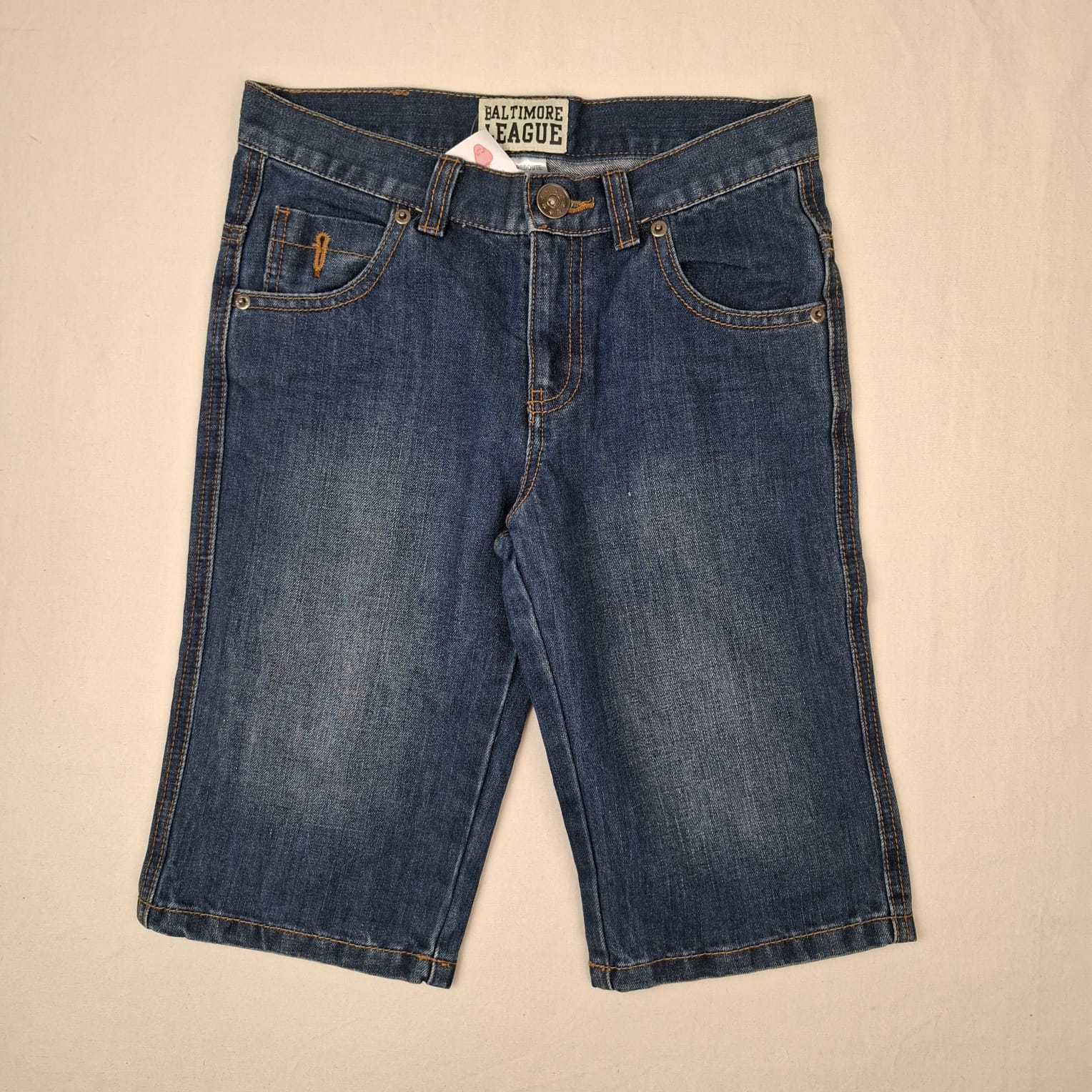 Autres commentaires : 21% polyester. Bermuda en jean bleu foncé, coupe droite, fermeture devant par bouton et zip.