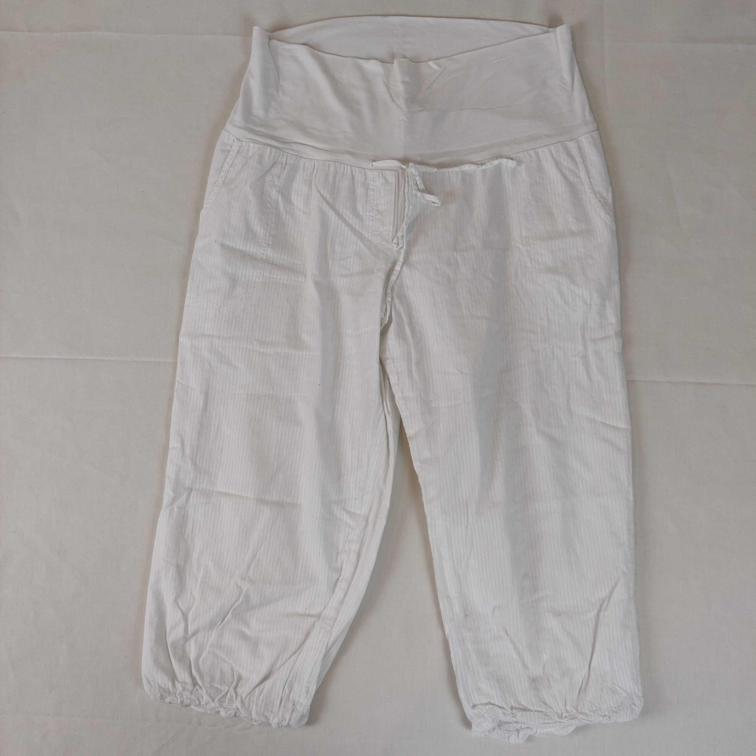 Autres commentaires : Pantacourt ou corsaire blanc en toile légère très agréable. Taille ajustable par cordon. Bas du pantacourt élastiqué. Tâche grise en haut du bandeau au dos, devrait être cachée par le top.