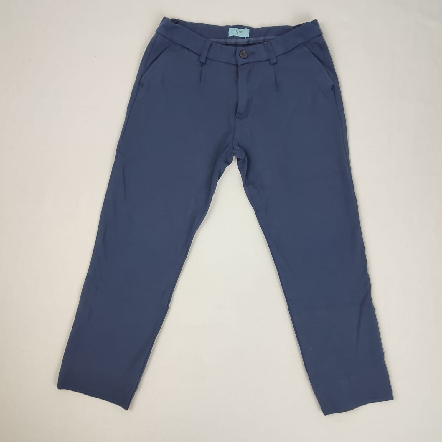Autres commentaires : Pantacourt bleu marine à pinces, ceinture ajustable par élastique intérieur, fermeture par zip et bouton classique. Taille estimée 14 ans.
