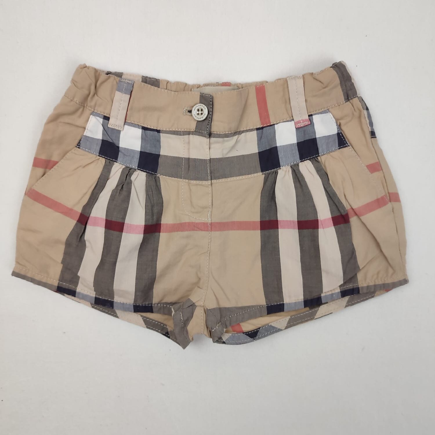 Autres commentaires : Short beige à carreaux noirs, blancs et rouges Burberry, fermeture par bouton et zip, taille ajustable.