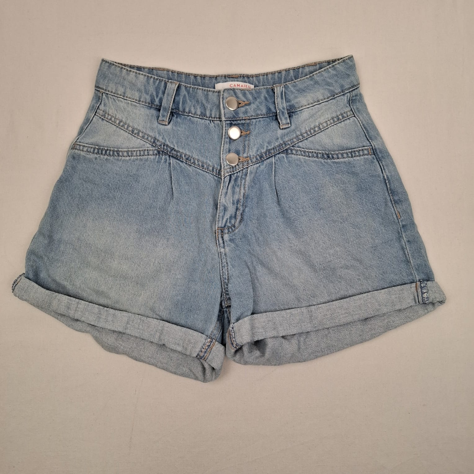 Autres commentaires : Short large retroussé en denim bleu clair, fermeture par boutons et zip.