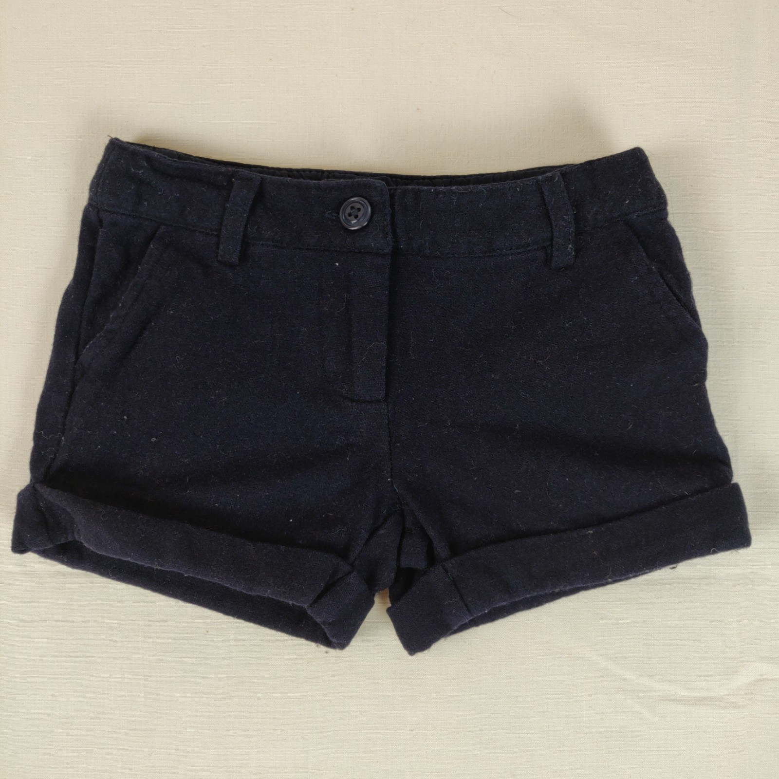 Autres commentaires : 50% viscose. Short – bleu marine – taille ajustable. Ouverture centrale à fermeture éclair et bouton classique. Rebords du short retroussés. Passants pour une ceinture. Léger effet pelucheux.
