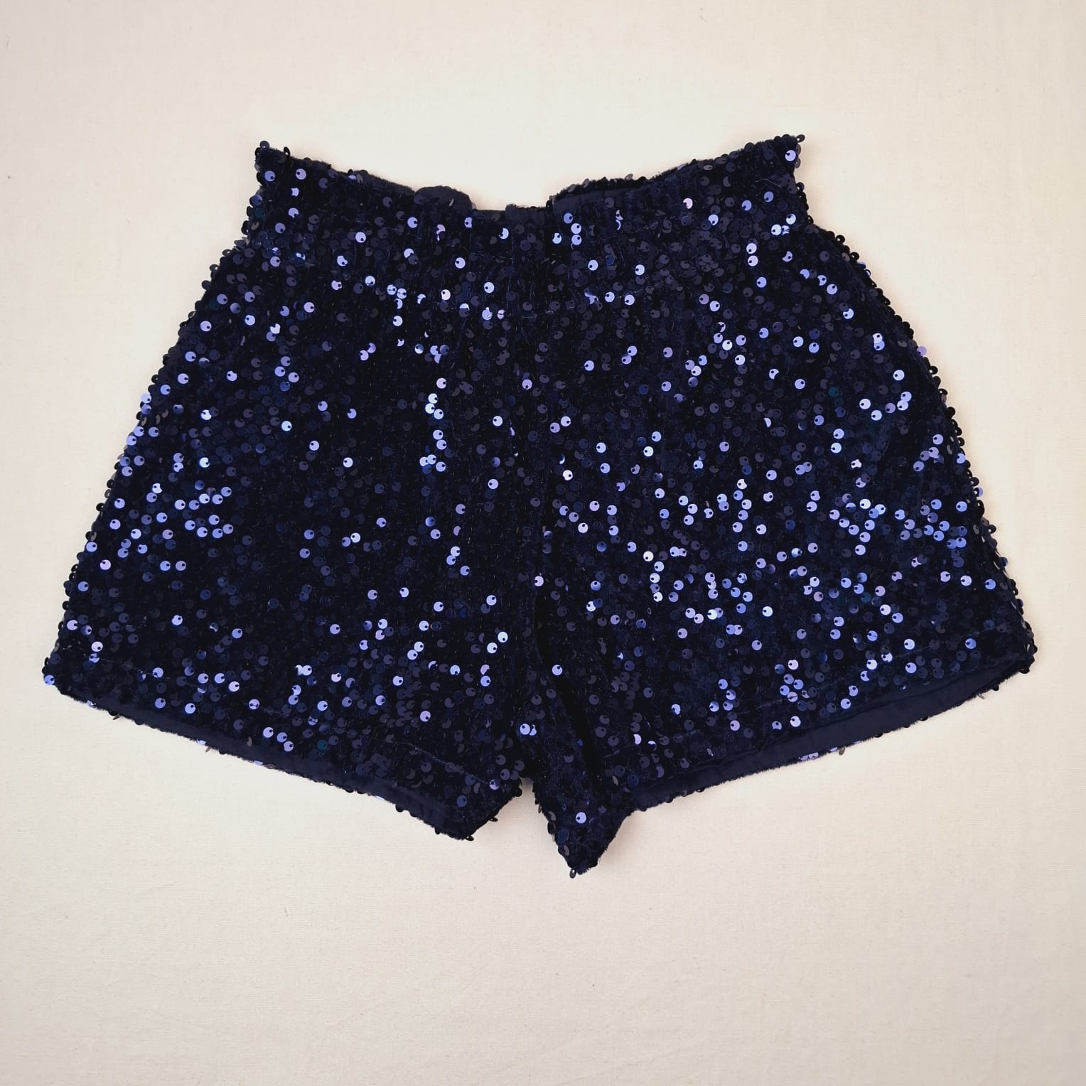 Autres commentaires : Short bleu foncé à sequins, taille élastique, doublure en coton 100%.