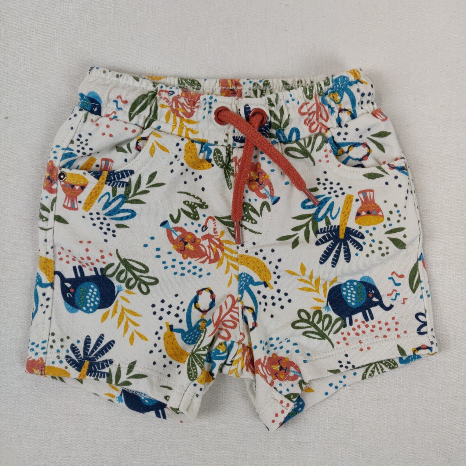 Autres commentaires : Short – blanc à motifs animaux de la jungle multicolores. Taille élastique avec cordon interne marron. 2 poches latérales et 2 poches arrières.