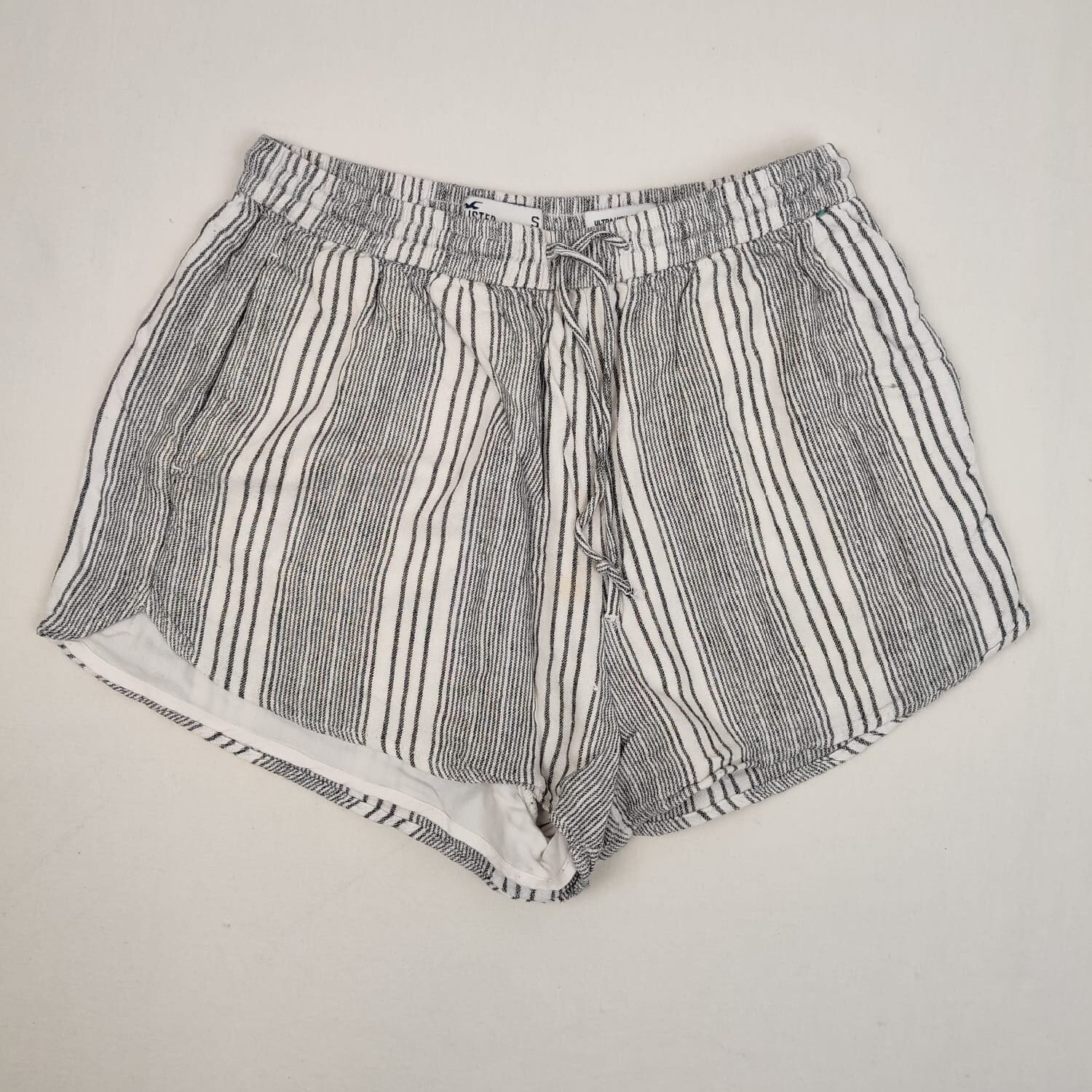 Autres commentaires : 20% lin. Short blanc à rayures bleu-gris, doublure 100% viscose, large taille élastiquée avec lanières.