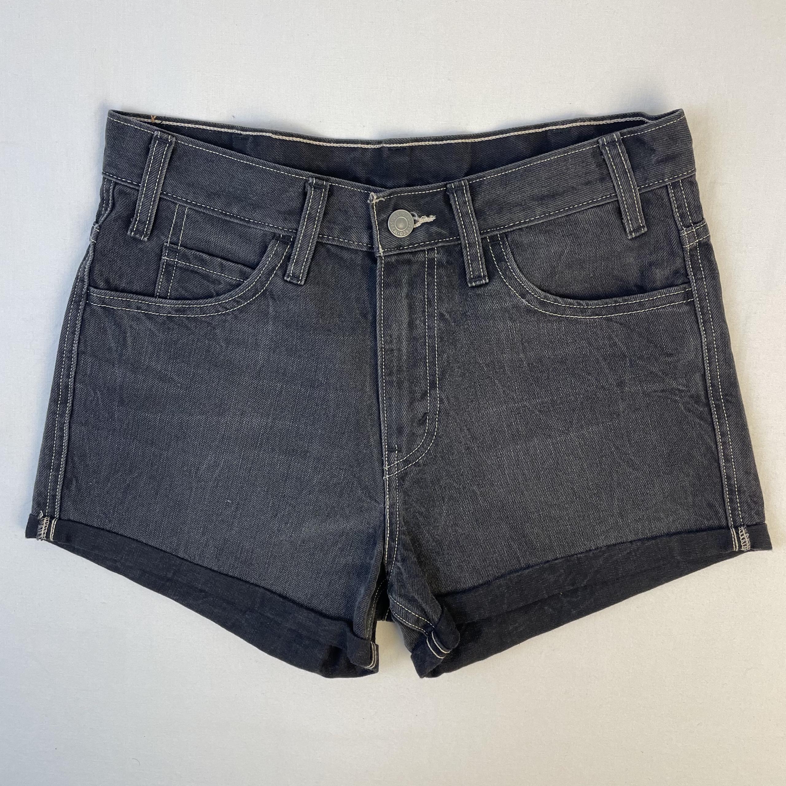 - Short 5 poches en denim, fermeture par zip, bas retroussé, ceinture avec passants, taillle 27.