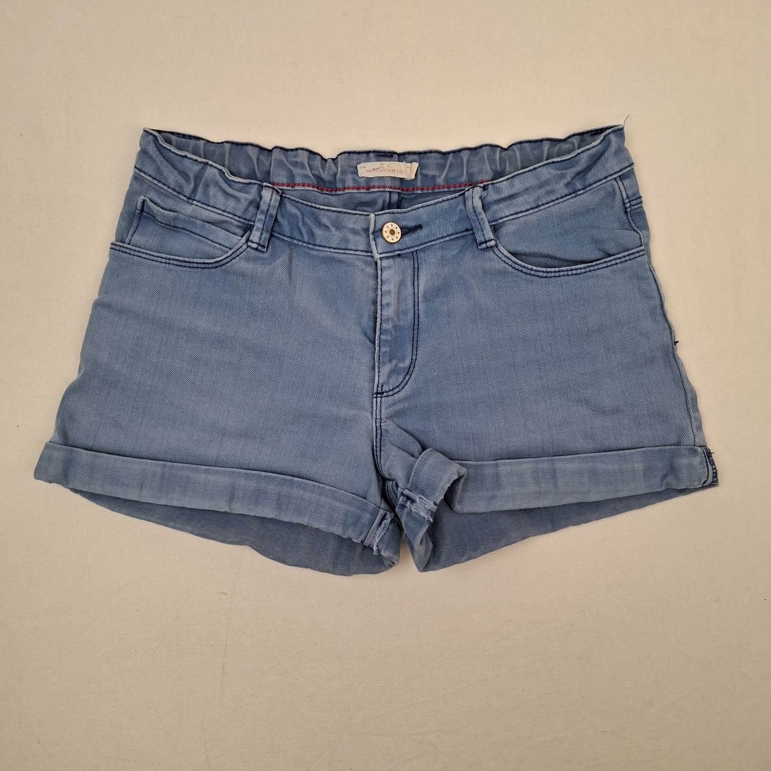 Autres commentaires : Short en jean bleu, taille ajustable par élastique intérieur, fermeture par boutons et zip.