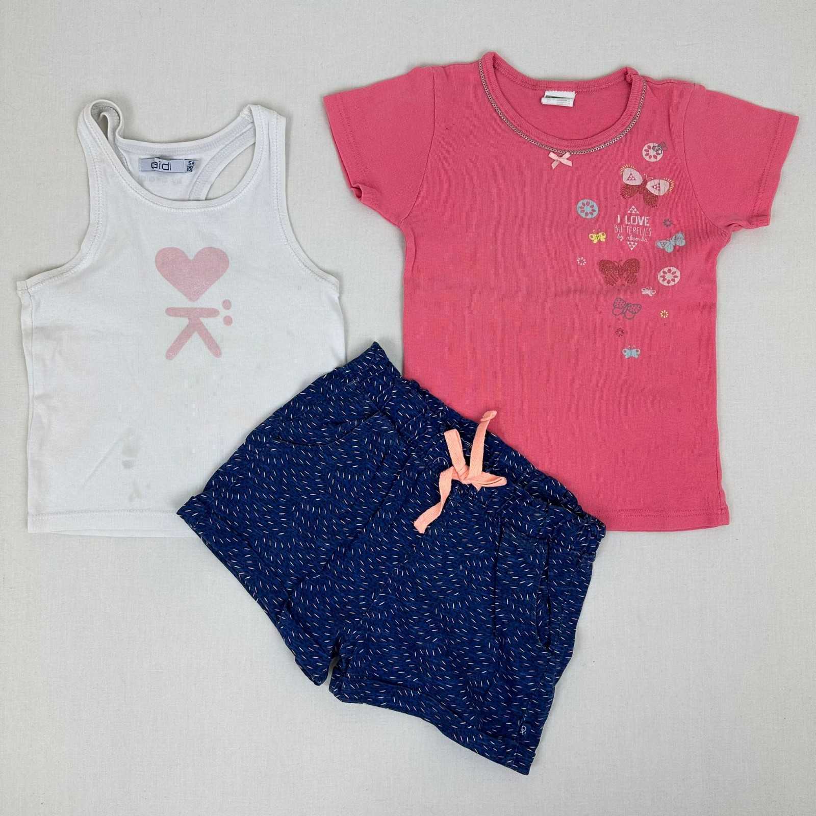 Autres commentaires : Short bleu avec motif avec traits rose et blanc avec taille élastiquée. Un t-shirt et un debardeurs offert.