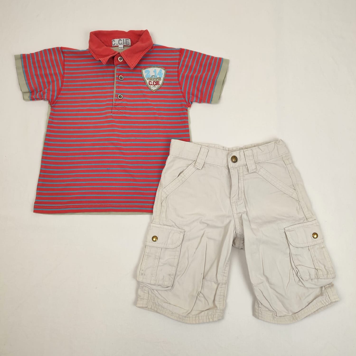 Autres commentaires : Short beige, ceinture ajustable par élastique intérieur, fermeture par bouton et zip, multi-poche. OFFERT polo manches courtes rouge à rayures bleues C.CIE. (petit trou)