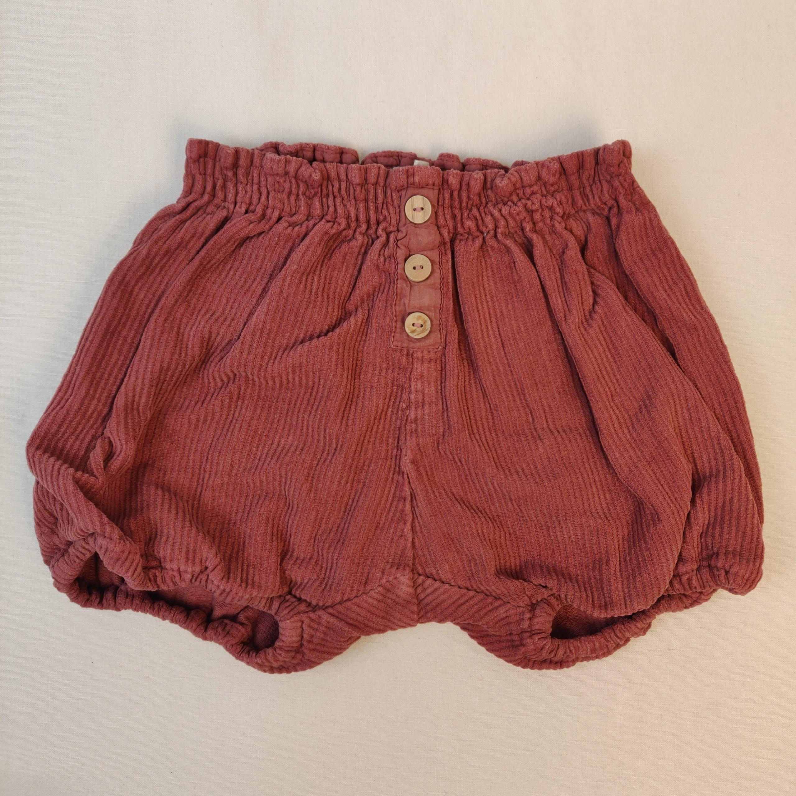 - bloomer en velours rouge, taille et cuisse élastiquées, boutons décoratifs à l’avant