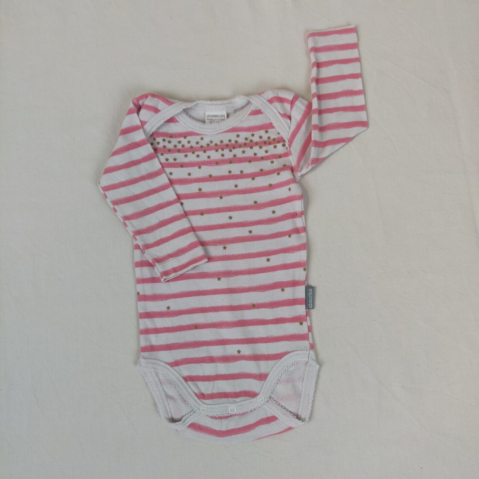 Autres commentaires : Un body à manches longues – blanc rayé rose. Motifs fines étoiles dorées.