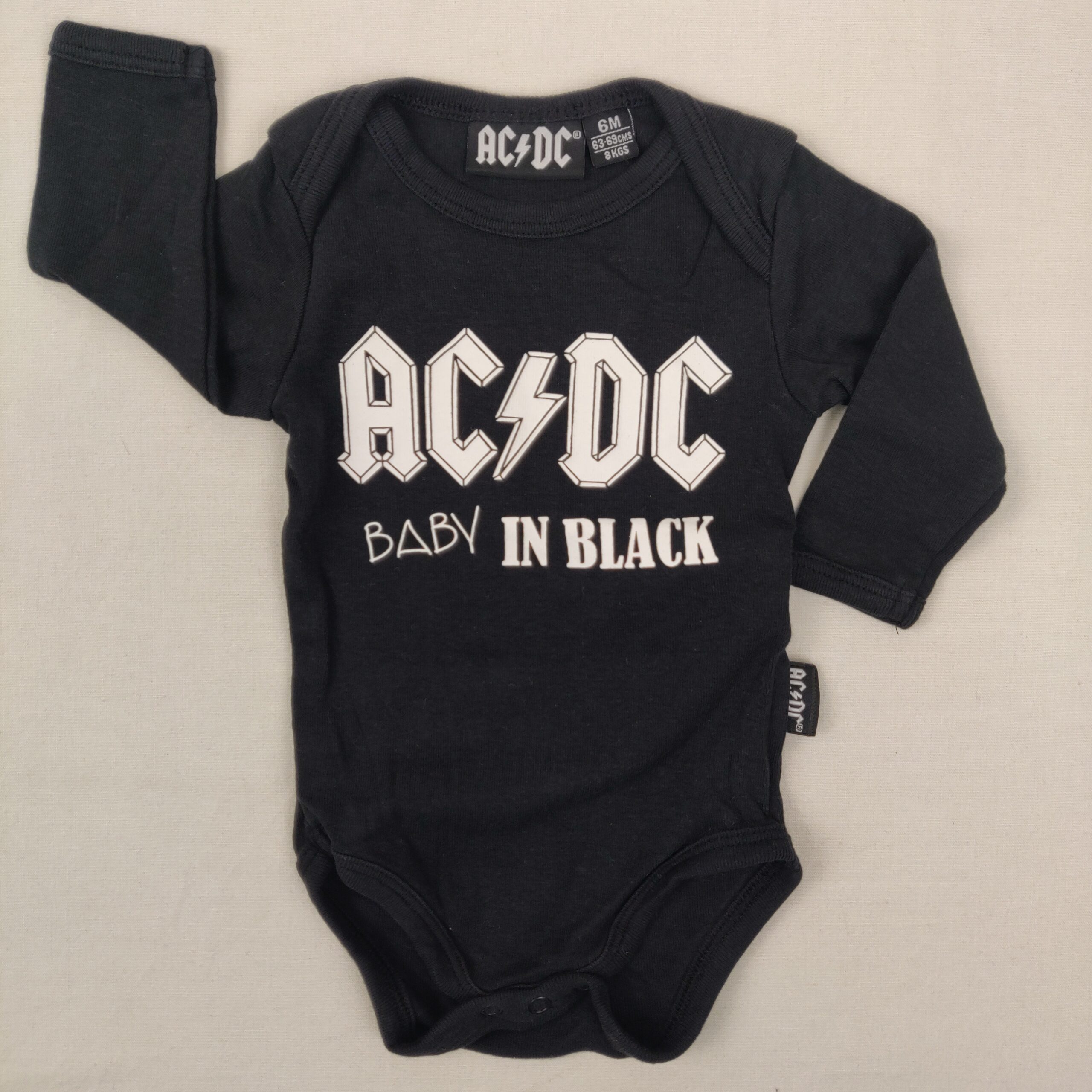 Autres commentaires : Body manches longues, fermeture par boutons pression au bas, devant inscription « AC&DC baby in black ».