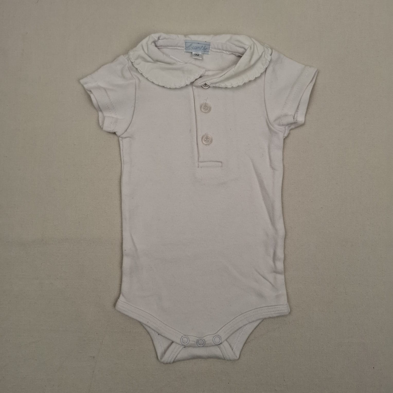 Autres commentaires : Body uni blanc manches courtes, col claudine dentelé fermé devant par 3 boutons.
