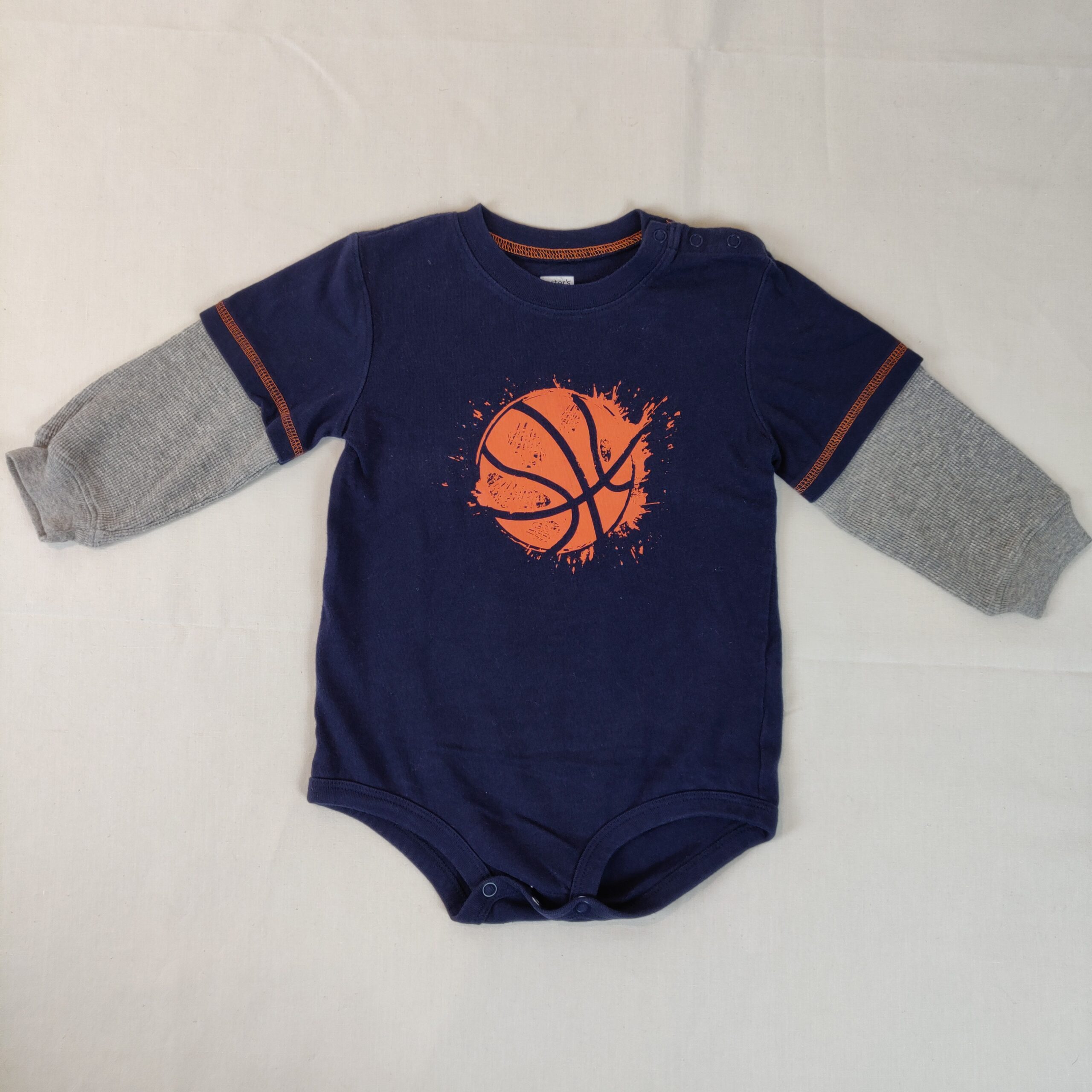 Autres commentaires : Body à manches longues bicolores (bleu marine et grises) – bleu marine avec motif central ballon de basket – ouverture latérale à partir du col à 3 boutons pression. Ouverture à l’entre-jambe à 3 boutons pression.