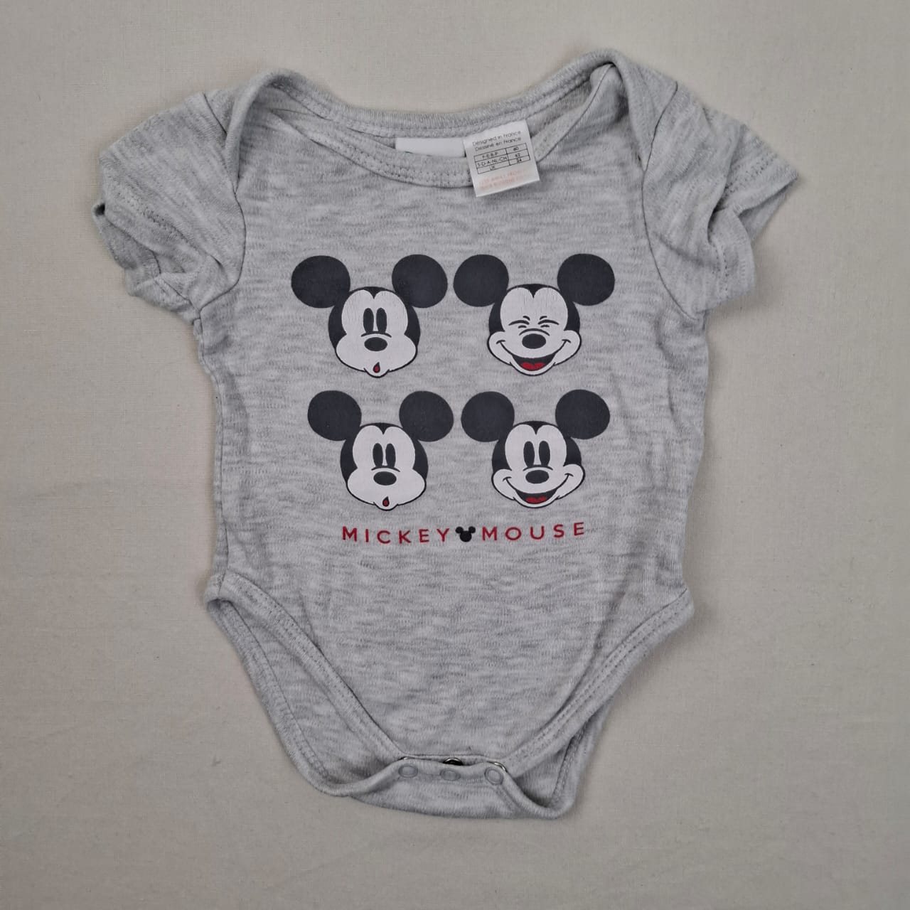 Autres commentaires : 2% polyester. Body gris à manches courtes, sur le devant motifs têtes Mickey légèrement craquelées.