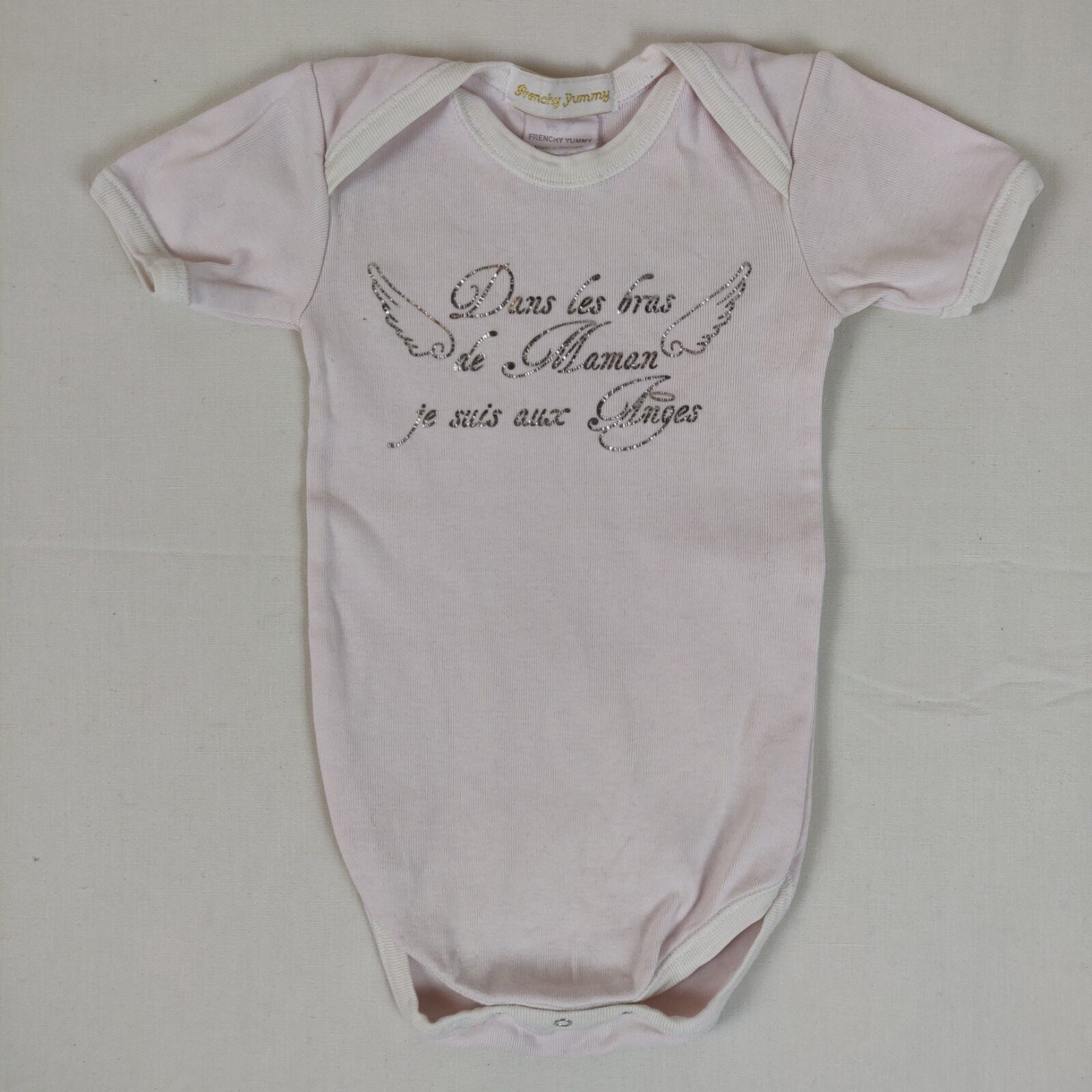 Autres commentaires : Body à manches courtes – écru avec inscription centrale en lettres argentées « Dans les bras de Maman je suis aux anges ». Ouverture à l’entrejambe à 3 boutons pression.