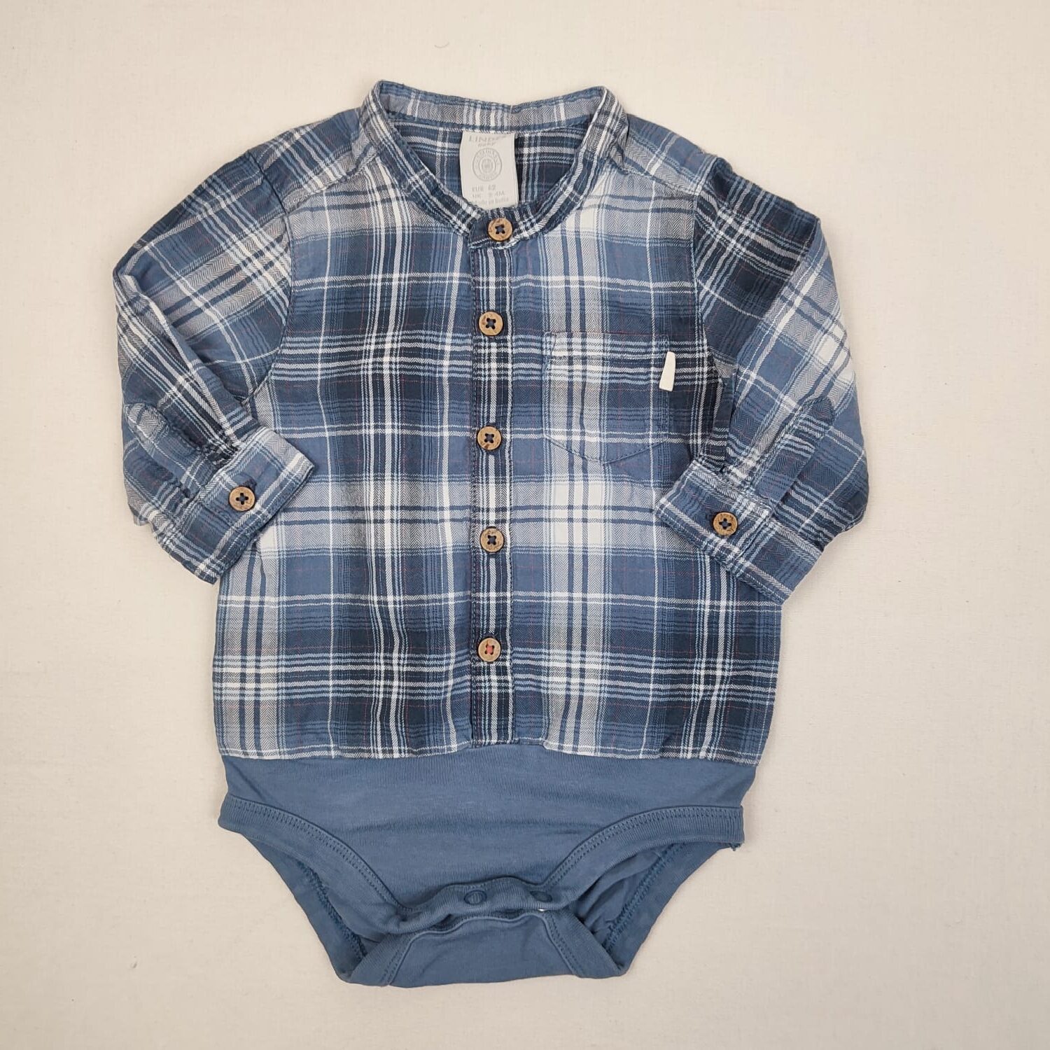 Autres commentaires : Body manches longues à carreaux bleus et gris, uni gris en bas, col officier, fermeture par boutons devant et boutons pression à l’entrejambe.